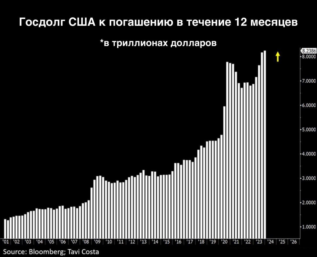На графике вы видите колоссальный объем долга, который США нужно погасить в 2024 году.