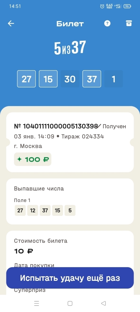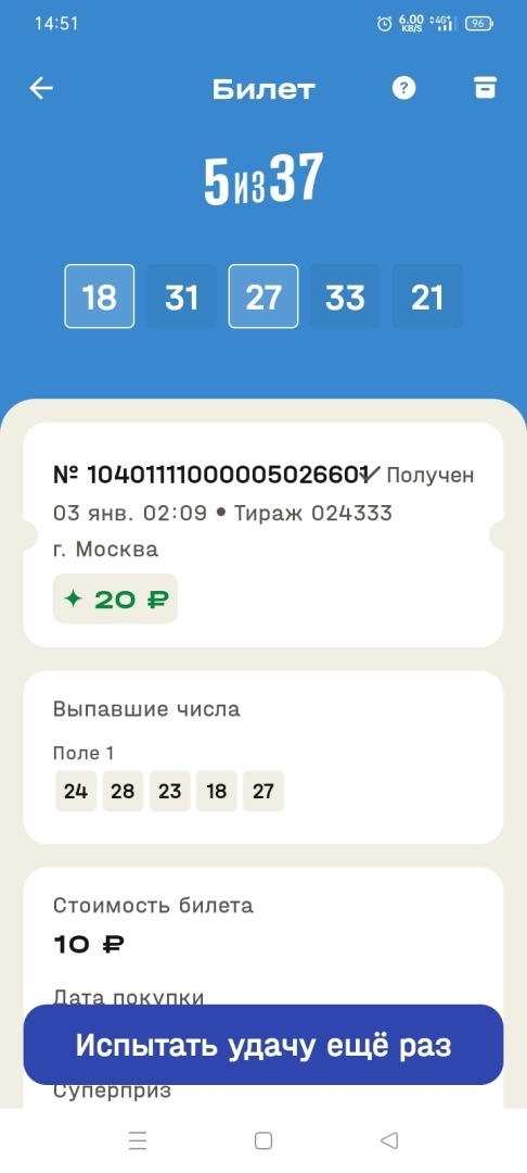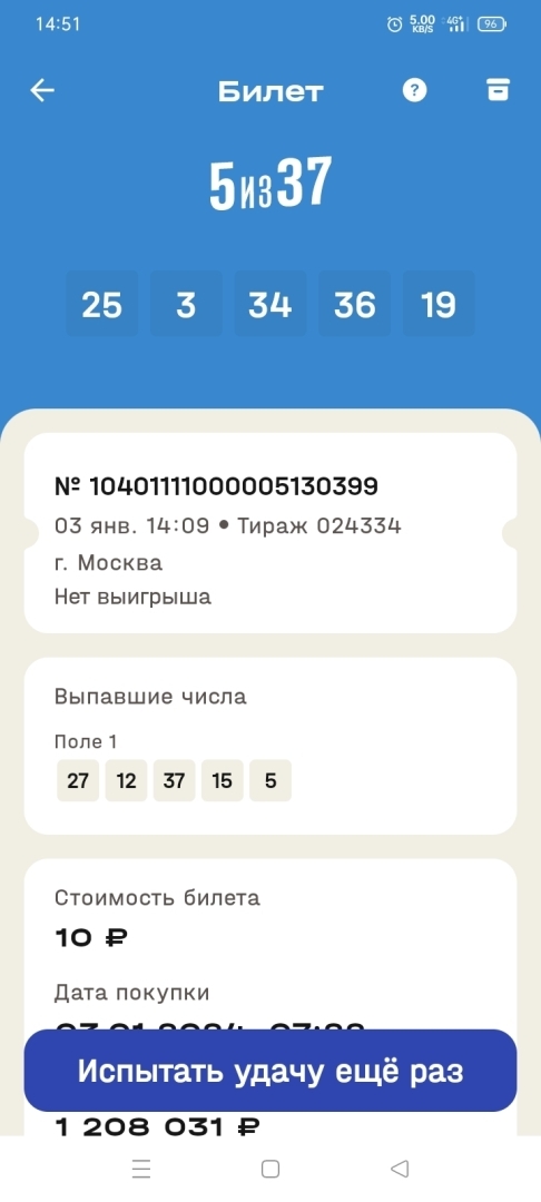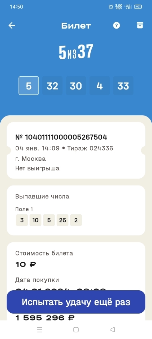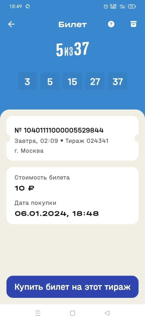 Купил сегодня ещё 2 билета 5 из 37,заполнил их согласно выпавших чисел.