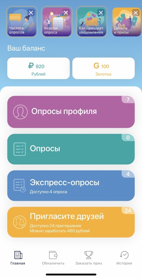 В остальных случаях если вы прошли опрос до конца вы получаете 20, 30, 40, 50 и так далее рублей, в основном потолок 100 рублей, не помню, чтобы за один опрос цена была выше ста рублей.