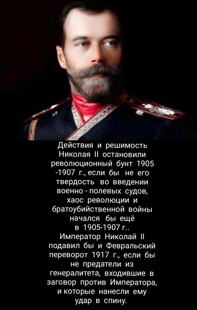 В заключении хотелось бы привести такой вывод : "Действия и решимость, Царя Николая II остановили революционный бунт 1905 -1907 годов, если бы не его твердость во введении военно - полевых судов, хаос революции и братоубийственной войны начался бы ещё в 1905-1907 годах. Император Николай II подавил бы и Февральский переворот 1917 года, если бы не предатели из генералитета, входившие в заговор против Императора, считавшие, что Самодержавие уже устарело, что их чем-то обделили, что-то не дали, не так оценили и которые нанесли ему удар в спину, за что потом и сами поплатились".
