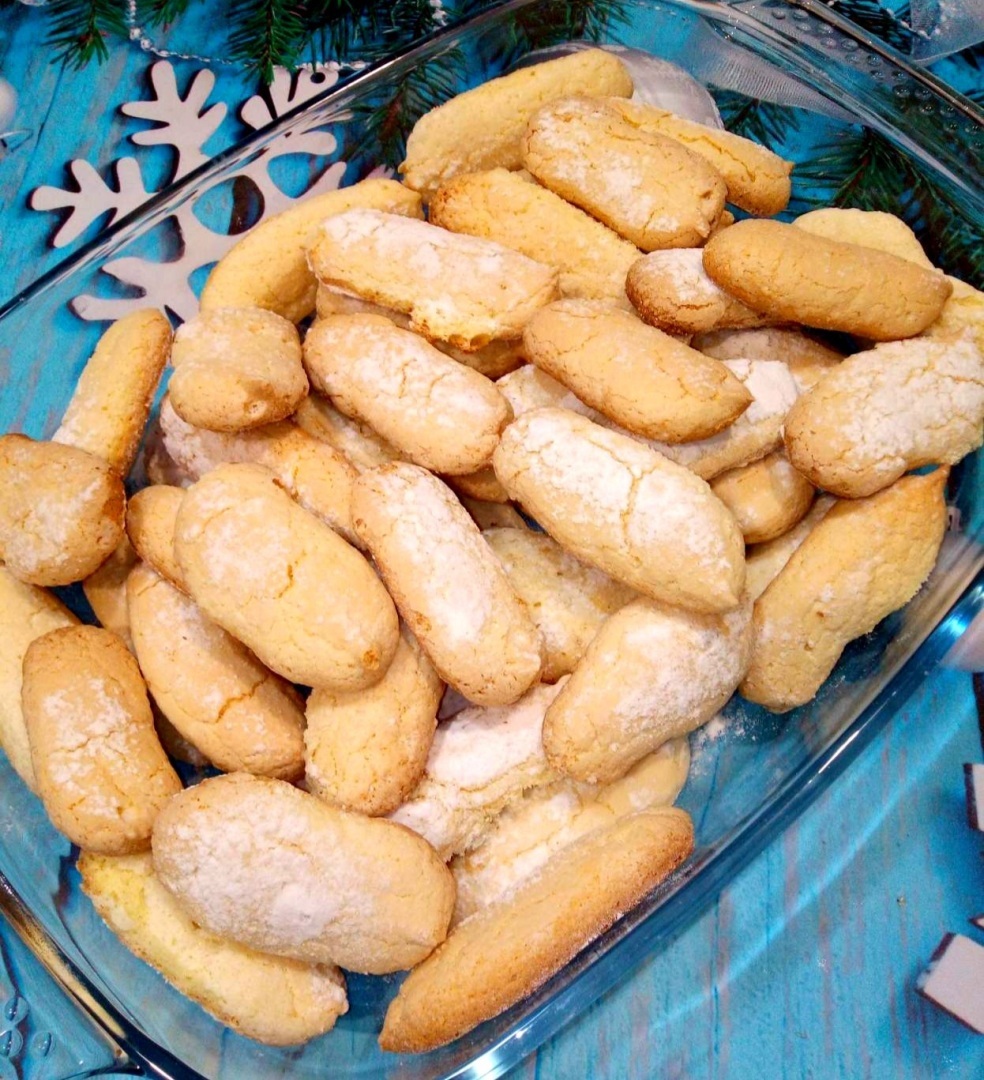 6. Переложить бисквитную основу в кондитерский мешок и аккуратно отсадить тесто на противень застеленный бумагой для выпечки полоски длиной 10 см. Сверху слегка присыпать сахарной пудрой и отправить в разогретую до 180 градусов духовку на 8-10 минут.