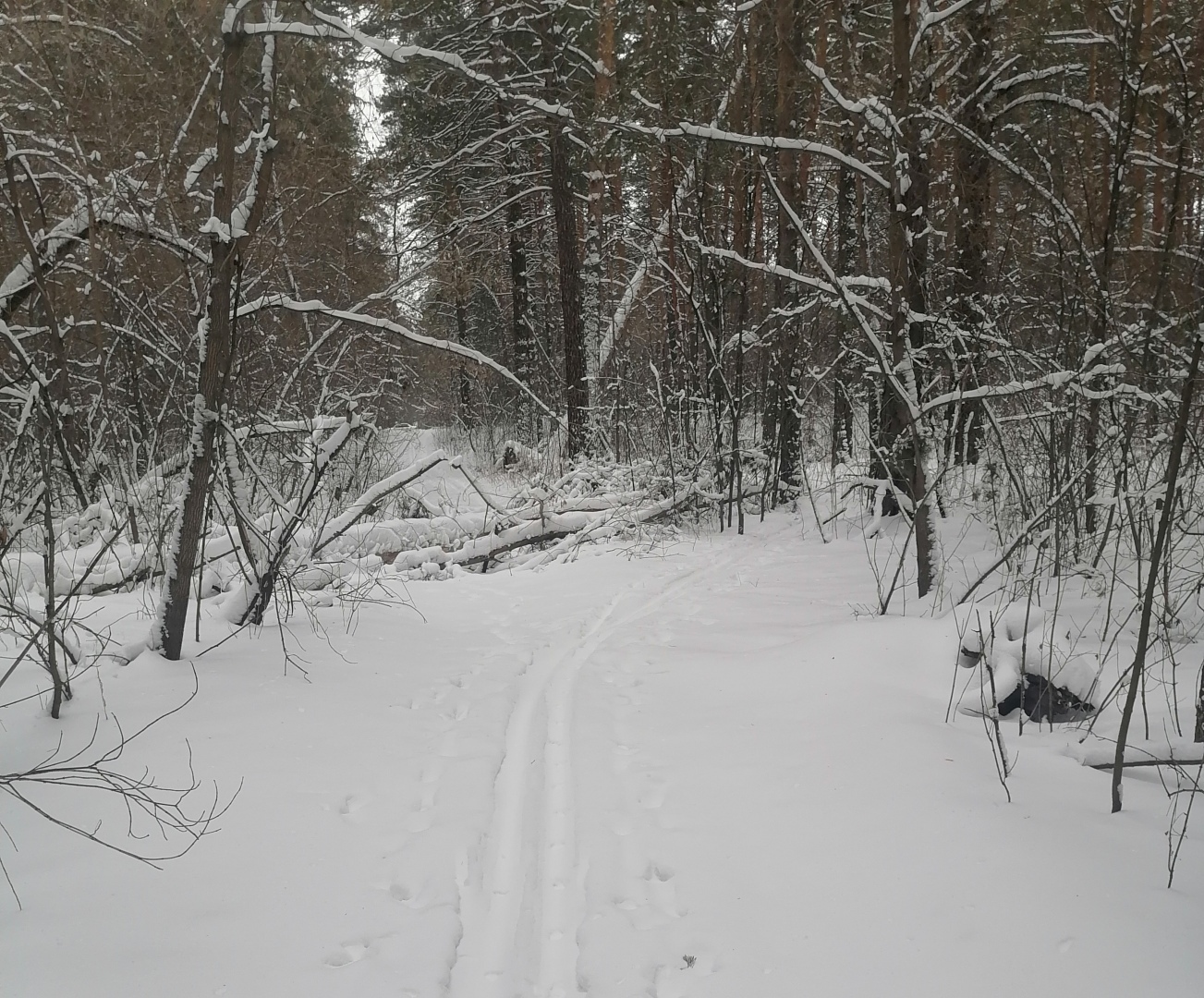 Первый раз на лыжах этой зимой удалось покататься только 6 января: снега не было и кругом деревья, поваленные сильным ветром ещё в начале зимы (огромные сосны лежат тут и там)