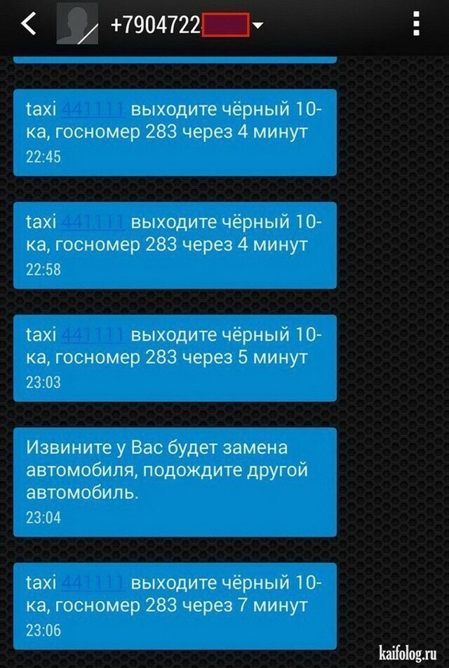 Тёмной - тёмной ночью на твой телефон звонит обиженный таксист из первой службы. Или даже пишет, о чудо! Где же Вы? Вам была нужна машина? Вы поедете?