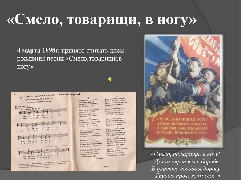 Да уж! В СССР было чем гордиться! Но надо идти вперёд! Только идущий осилит дорогу! Вперёд товарищи! Смело товарищи в ногу! Грудью окрепнем в борьбе!