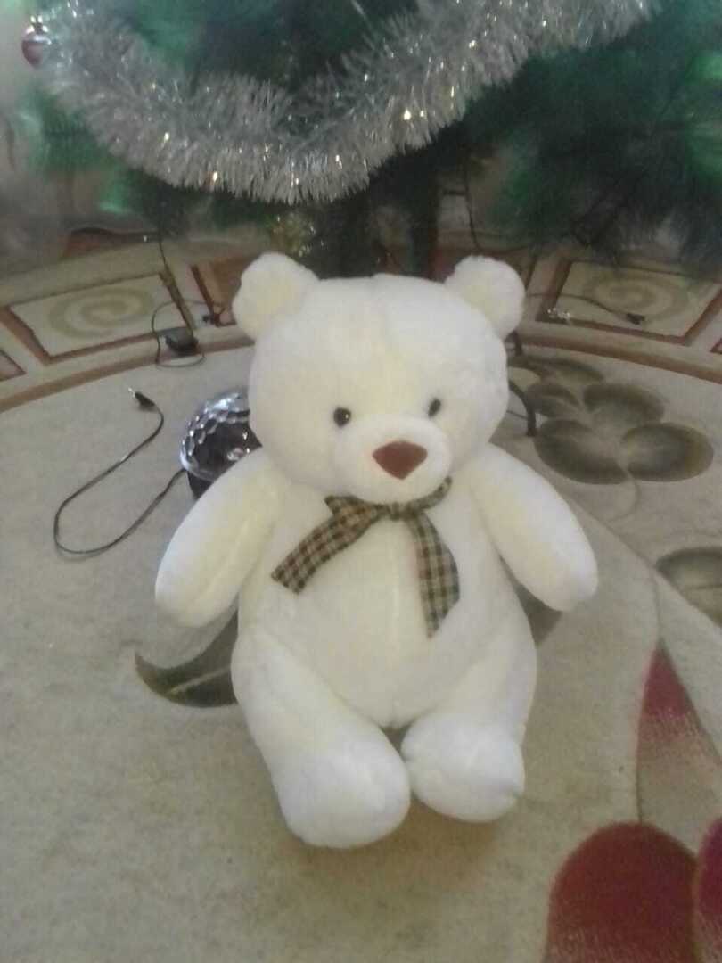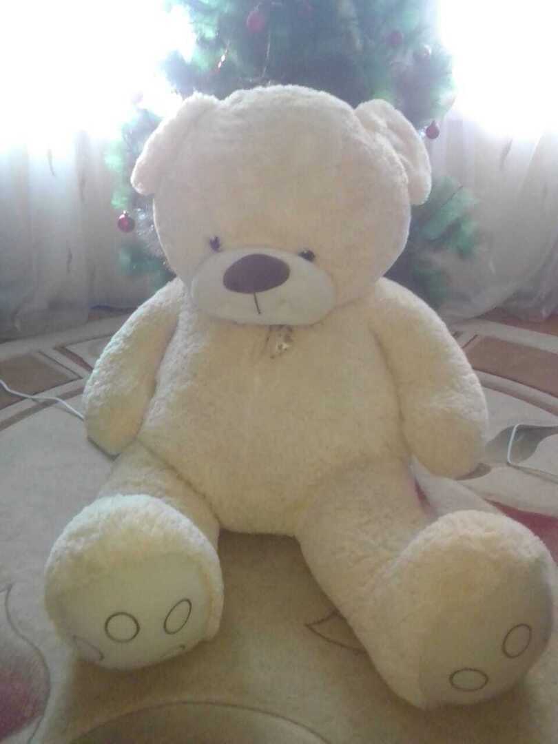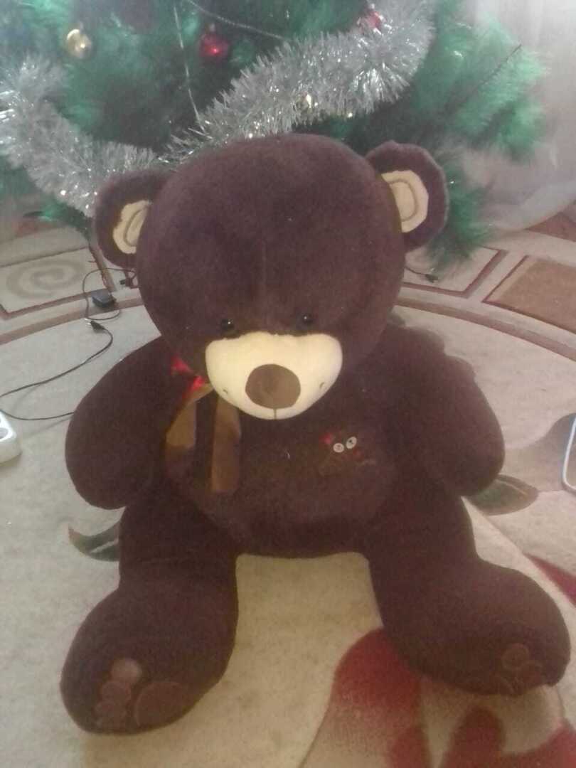 Это самая большая игрушка из ее коллекции. Мишка Тедди. По фотографии на фоне елочки Вы наверное поняли его габариты. Просто великан.