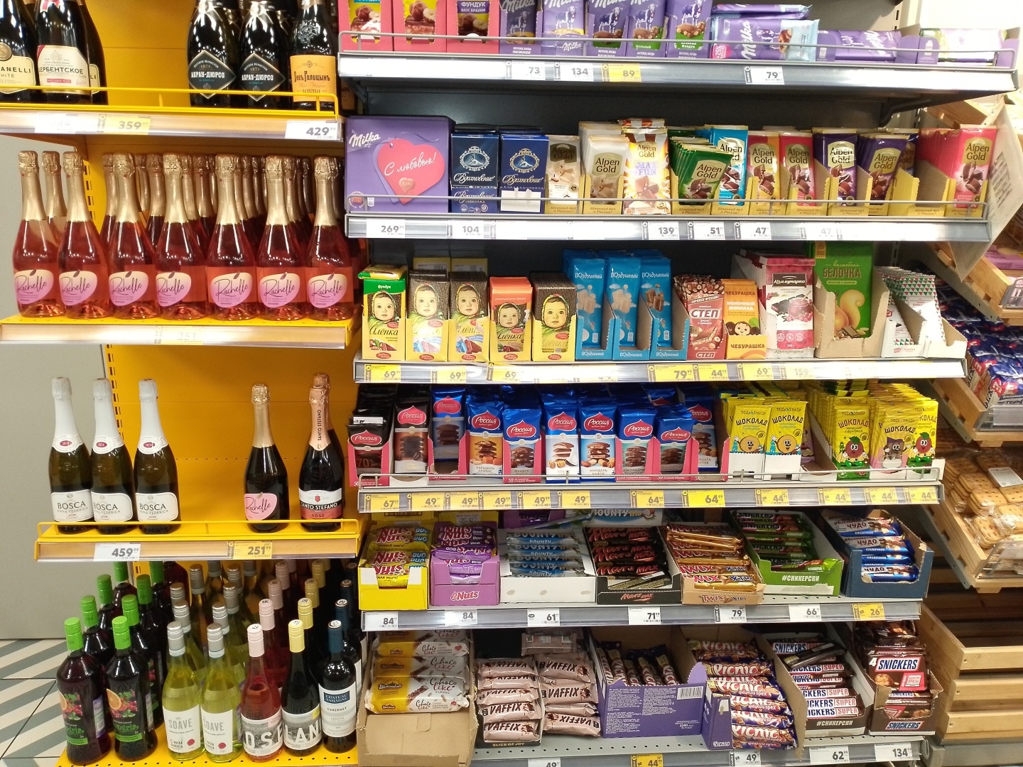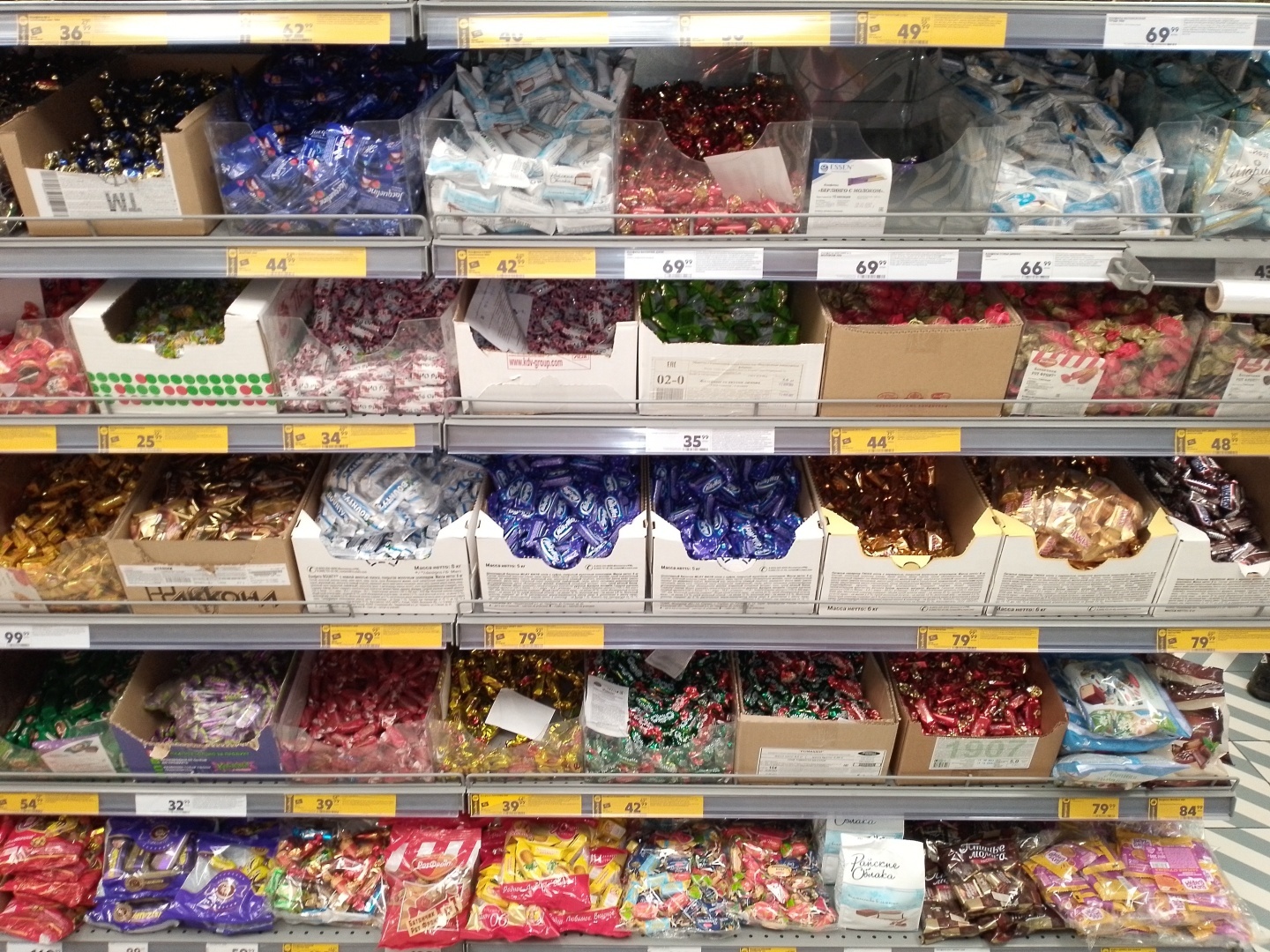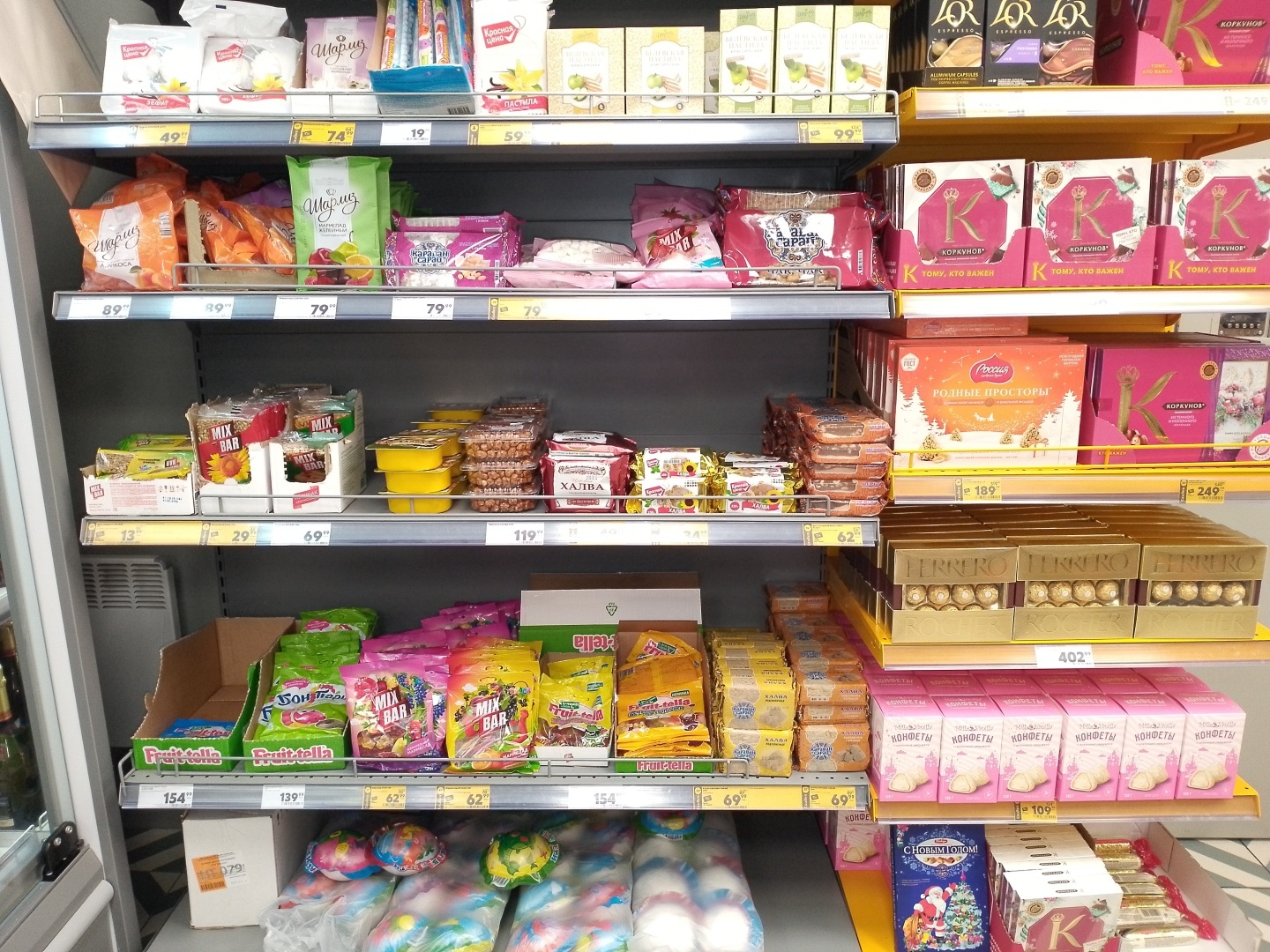 Полки буквально ломятся от различных товаров. Чего там только нет!