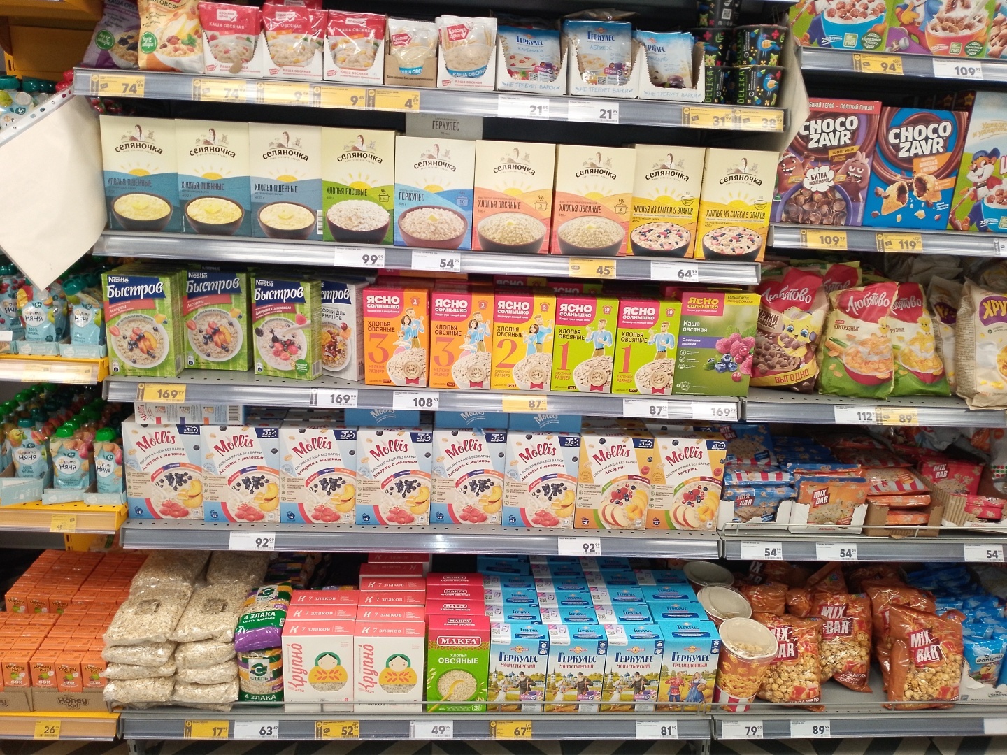 Очень много различных круп, завтраков быстрого приготовления. Цены, конечно, разные, и по акции есть, с очень хорошей скидкой, и без акции, соответственно подороже.