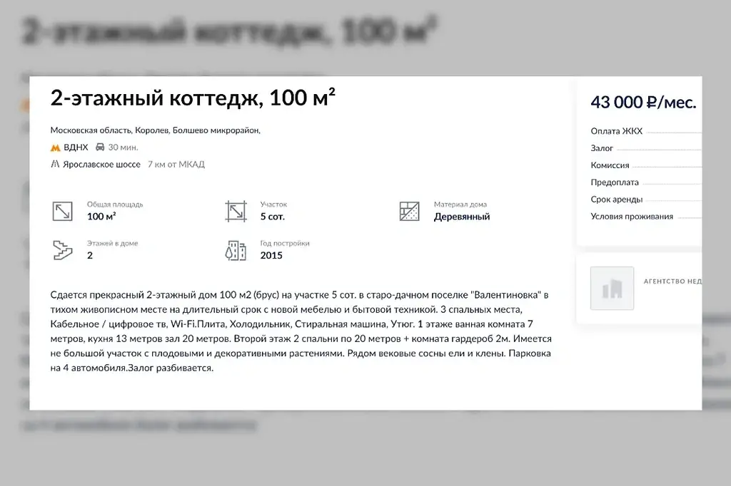 В последнее время коттедж сдавался в аренду. Недавно на сайте компании было размещено объявление о поиске арендатора, готового платить 43 000 рублей в месяц за весь комплект.