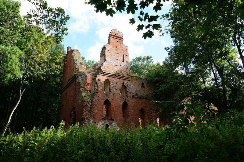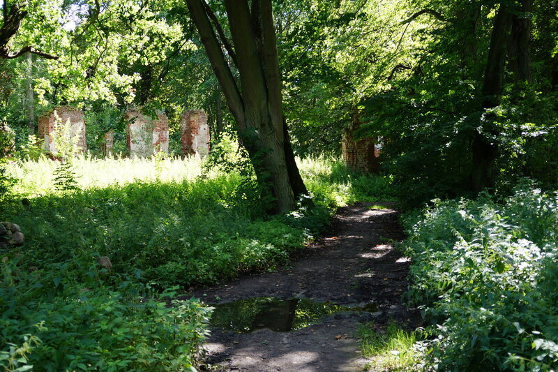 Сначала шли бои, а потом своё дело сделали копатели, коих я терпеть не могу, потому что они не зарывают после себя ямы. Идешь и думаешь, то ли воронка от снаряда, то ли след чёрного копателя. На фото все, что осталось от кирхи. Только представьте, что эта кирпичная кладка с 1250 года!
