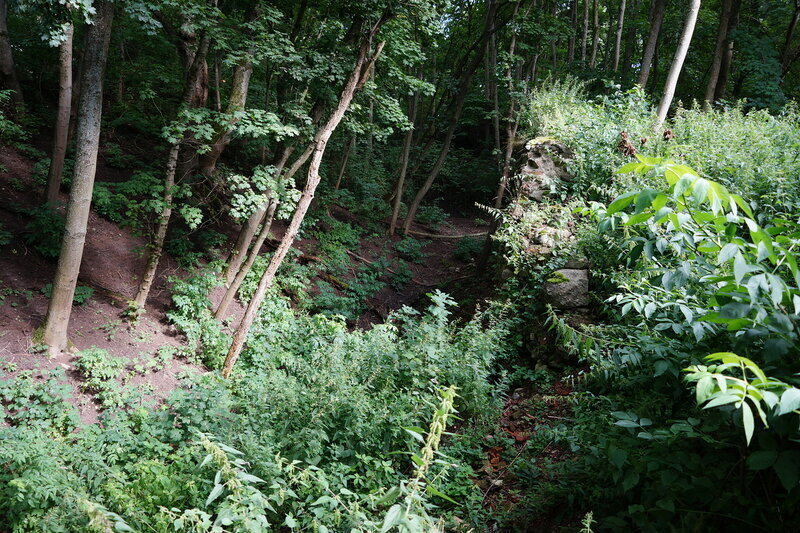 А вот и он! Остатки величественных стен, все заросшие зеленью. Летом, его вообще практически не видно. Лес. Кругом лес! Даже грибы растут, но собирать в таком месте - так себе идея. Они на костях!
