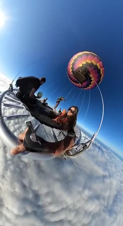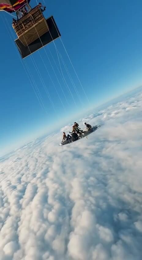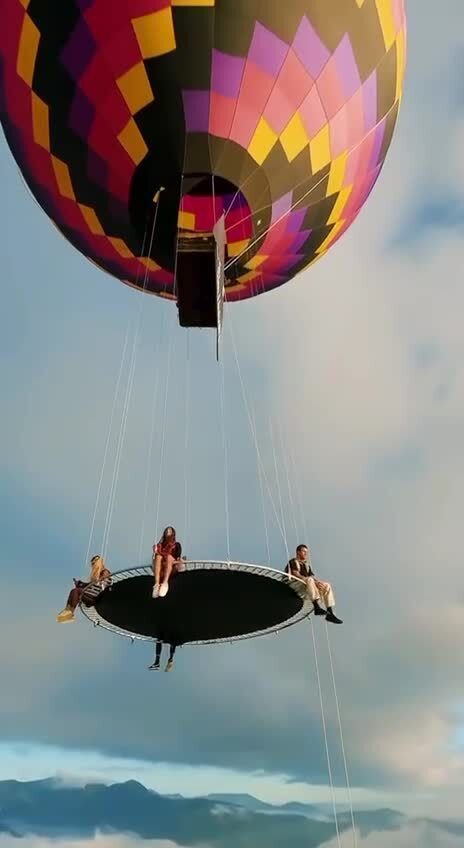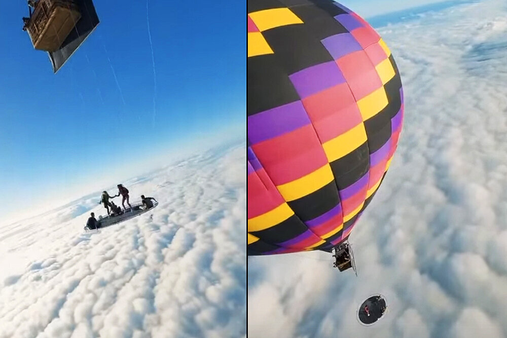 Экстремалы прикрепили батут к воздушному шару, поднялись в небо и устроили для своих фанатов поистине головокружительное зрелище. Вдоволь напрыгавшись и поиграв в мяч на огромной высоте, молодые люди по очереди отправились вниз. "