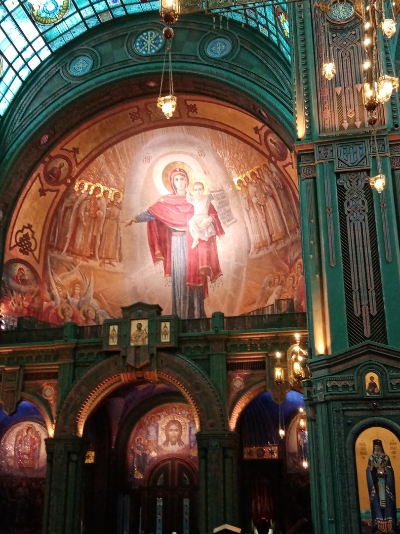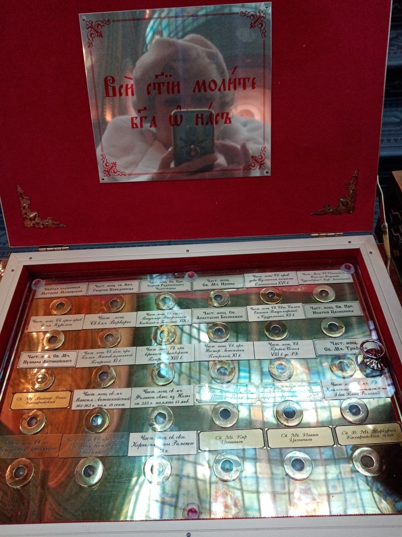 В Храме множество картин, выполненных из мозаики, чеканки. В центре верхнего Храма, который воздвигнут в честь Воскресения Христова, находится много икон и два ковчега с мощами Святых.