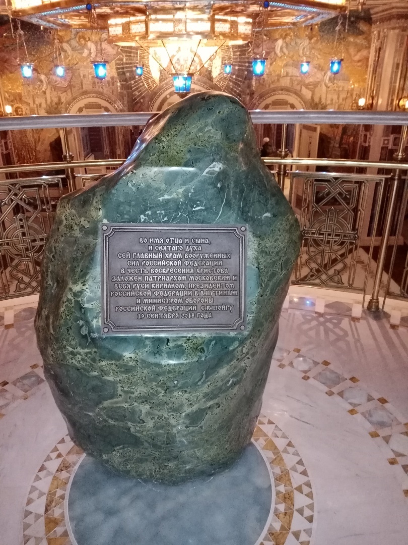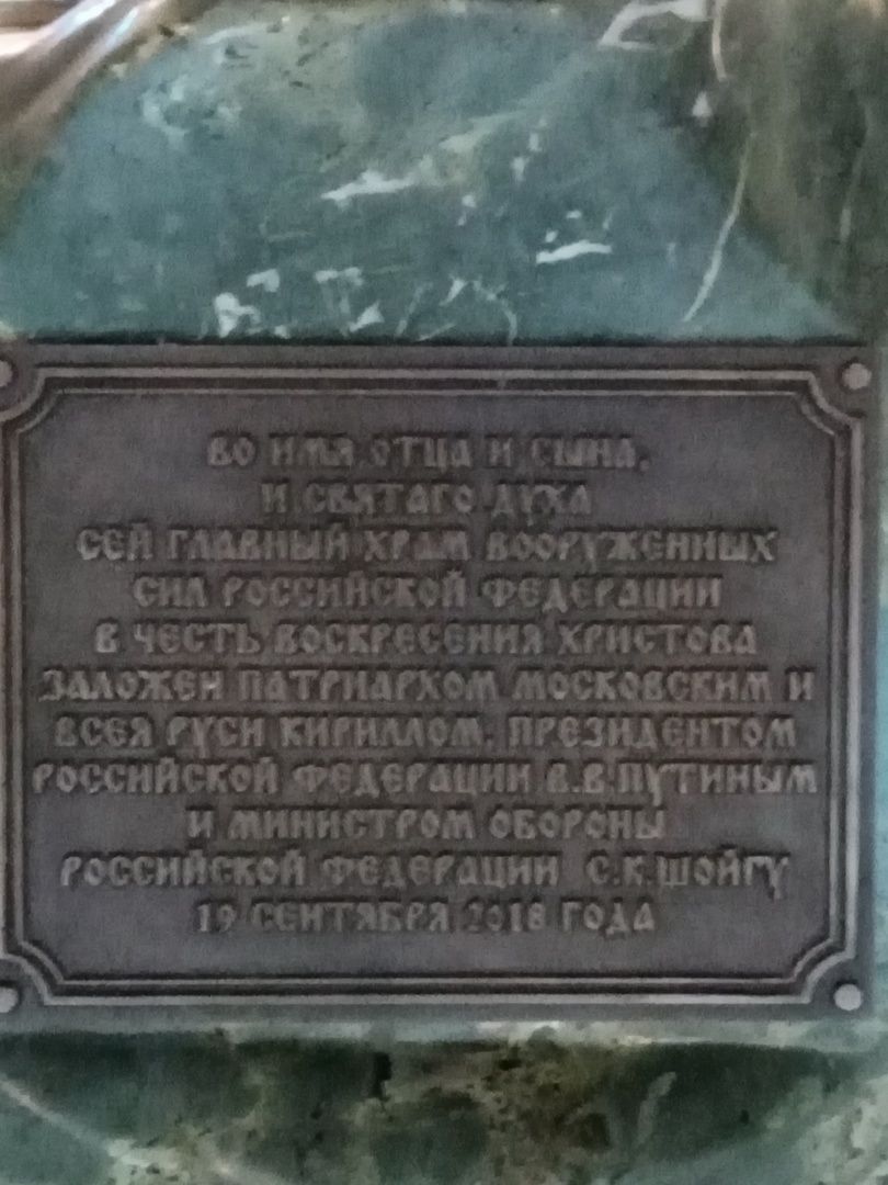 Главный Храм Вооруженных сил РФ создан в честь Воскресения Христова. В день этого события заложен камень с надписью, что Храм заложен Патриархом Московским и Всея Руси Кириллом, а также президентом В.В. Путиным и министром обороны С.К. Шойгу в 2018 году.