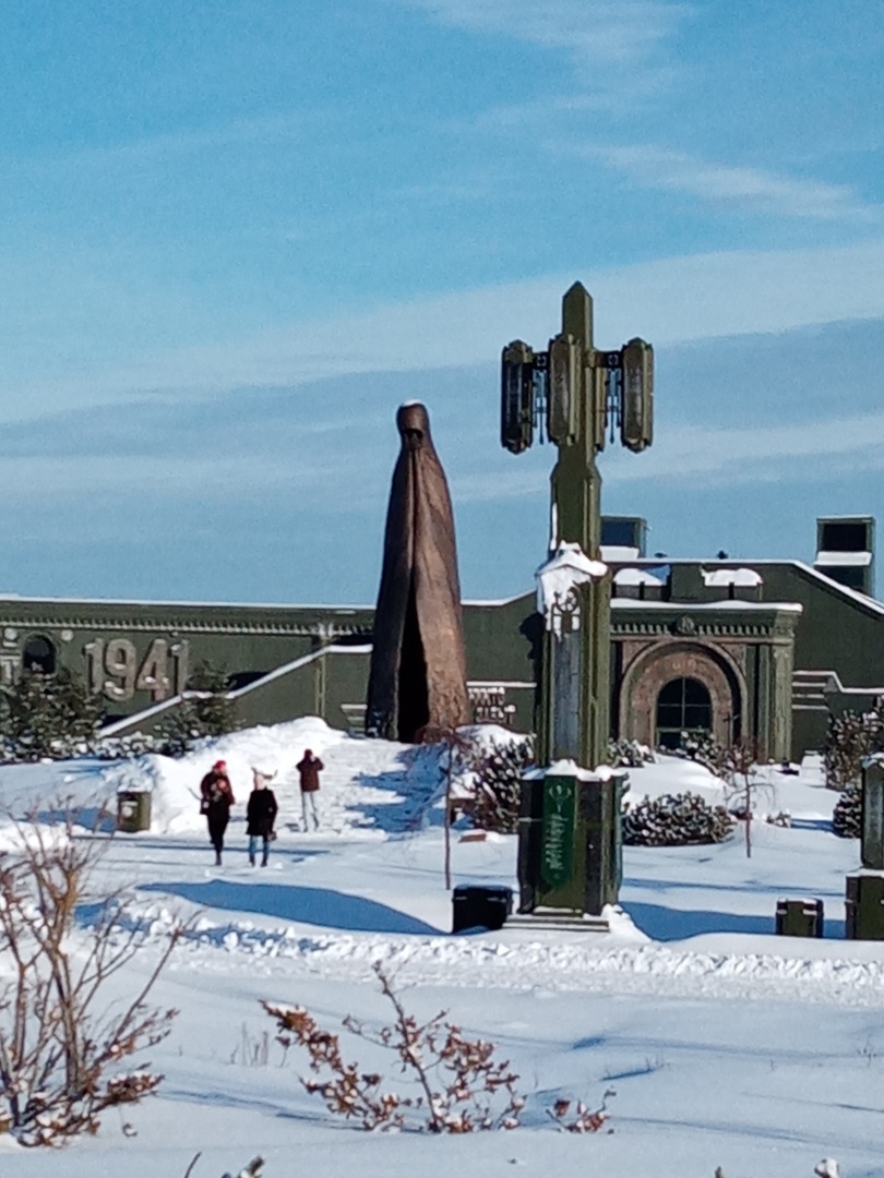 На выходе из Храма стоит мемориал "Плач матери". Внутри желающие зажигают свечи в память о погибших на войне.