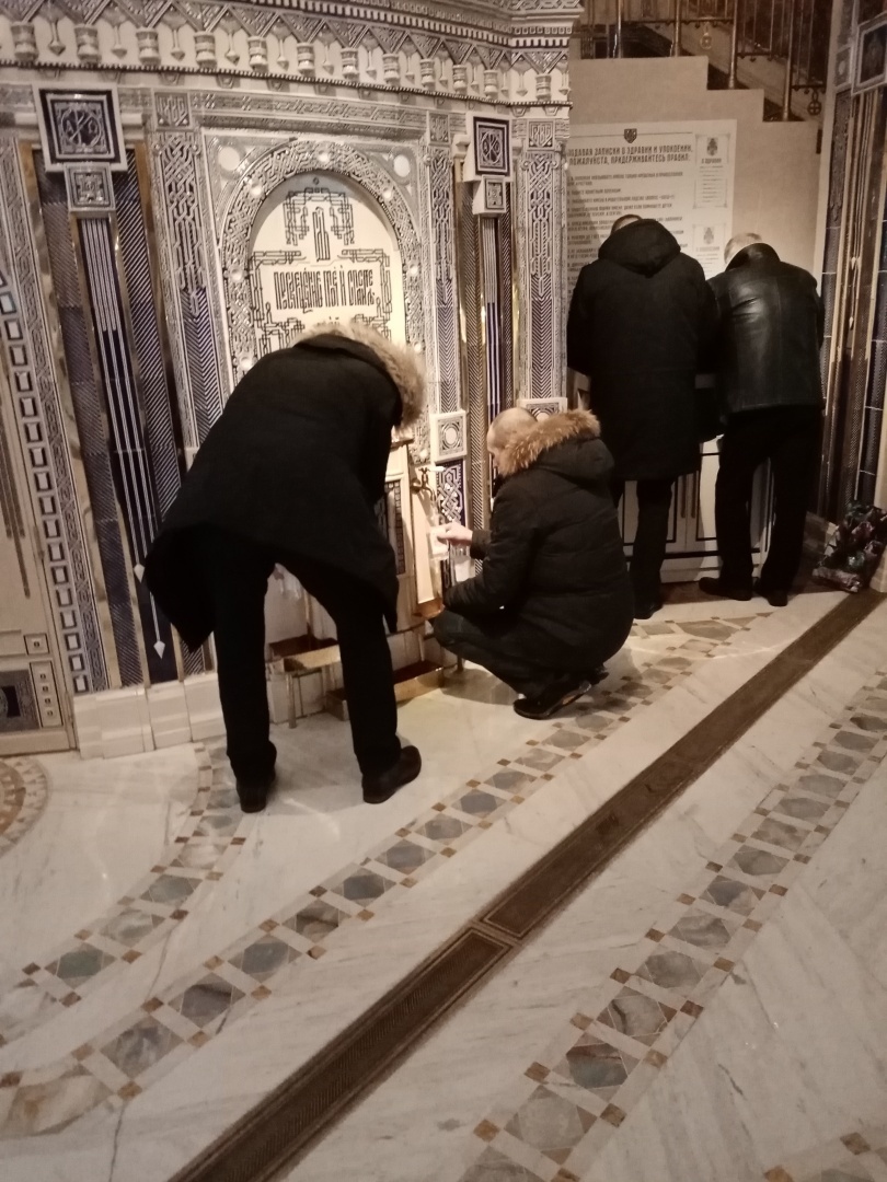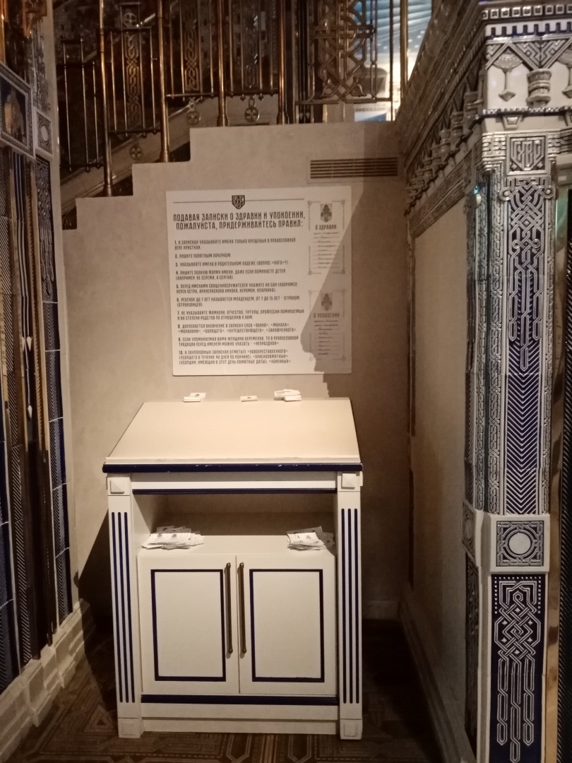 В нижней части Храма - в честь Святого князя Владимира, перед началом литургии желающие пишут и подают записки о здравии и упокоение усопших своих православных, крещеных христиан.