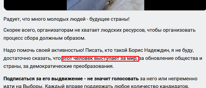 Надо помочь своей активностью! Писать, кто такой Борис Надеждин, я не буду, достаточно сказать, что этот человек выступает за мир, за обновление общества и страны, за демократические преобразования.