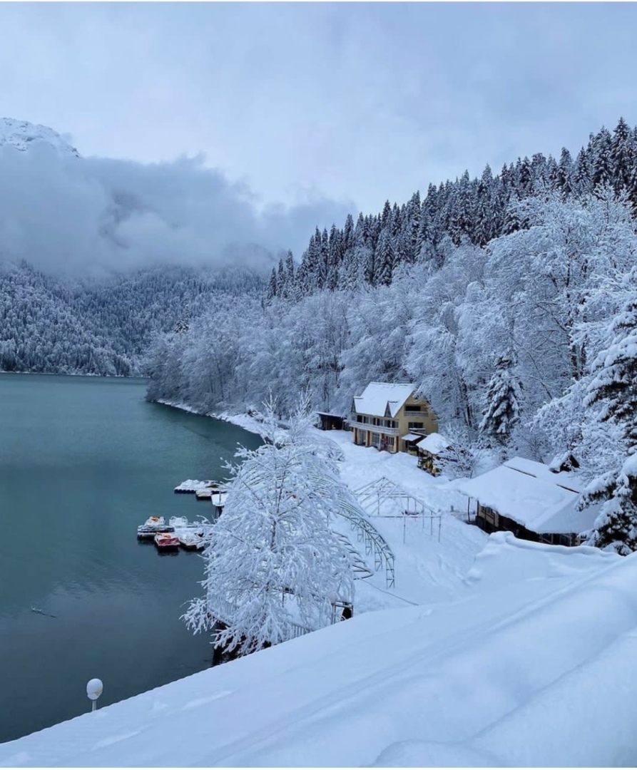 Зимой Рица по особенному сказочная, а если выпадет снег, то озеро и окрестности, будто укрываются заснеженным одеялом.
