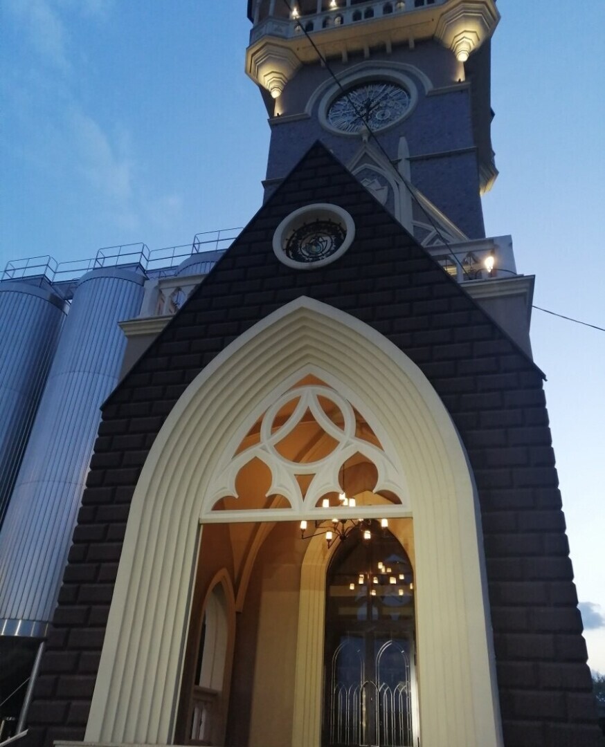 Как только мы приблизились к Замку-пивоварне «Таркос», нас поразила необычная архитектура здания. Замок, стилизованный под средневековый замок, восхищает своей мощью и красотой. Башни с флюгерами, огромные часы, галереи и витражные окна создают неповторимую атмосферу, будто мы попали в сказку или «Диснейленд».