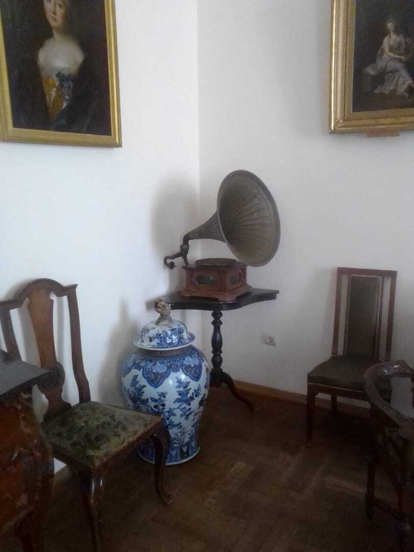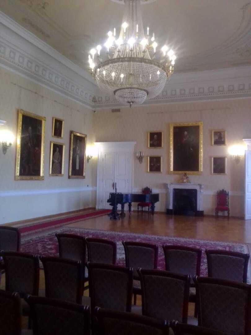 Это зала, в которой стоит пианино. Именно здесь проходили балы аристократов. Они танцевали вальс и другие танцы.
