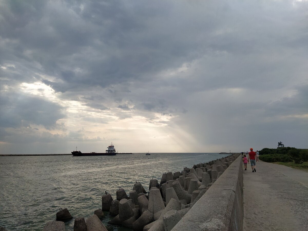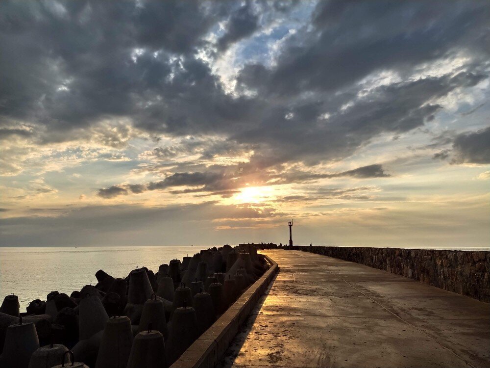 Лето. Балтийск. Северный мол. Днём стояла неимоверная жара, из дома вышли только вечером. Дорога до моря заняла около часа. Пробка была в сторону города. Все возвращались с пляжа, ну а мы ехали встречать закат!