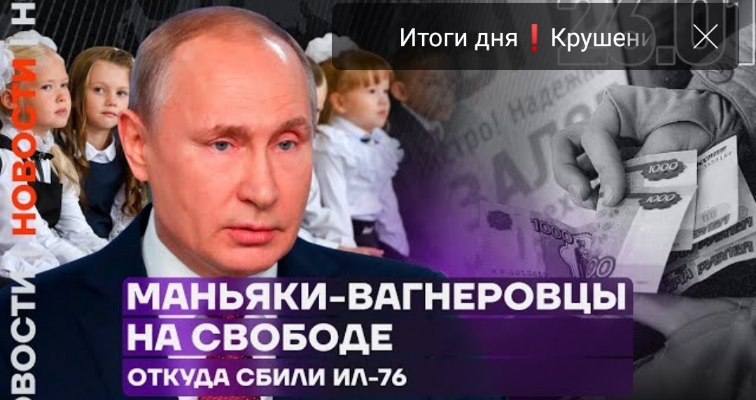 В российских регионах разыскивают сразу нескольких маньяков-вагнеровцев. Журналисты узнали, что «Яндекс» бесплатно размещал рекламу службы по контракту в армии, пока россияне оформляли микрозаймы — в прошлом году их было рекордное количество. СК РФ прокомментировал крушение самолёта ИЛ-76, а школьникам в Мариуполе рассказали, как сильно Владимир Путин любит детей.