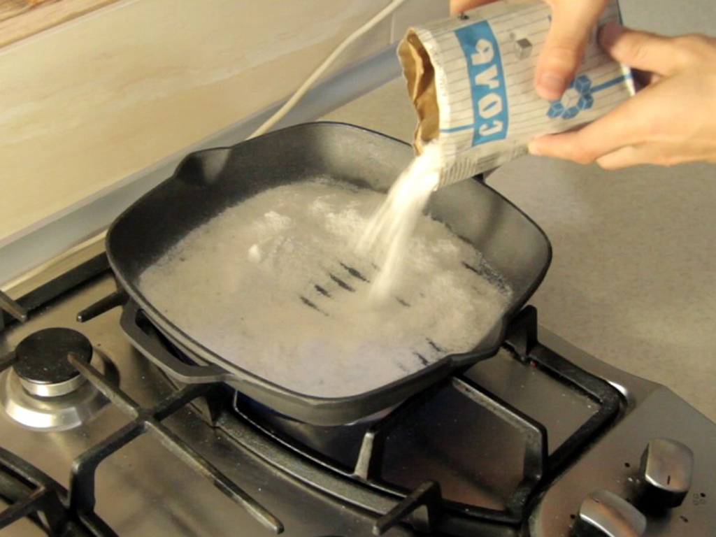 Так что, кто ещё не знал, достаём свои забракованные сковородки, насыпаем соли, чтобы дно скрыло и жарим, пока та ее станет коричневой.