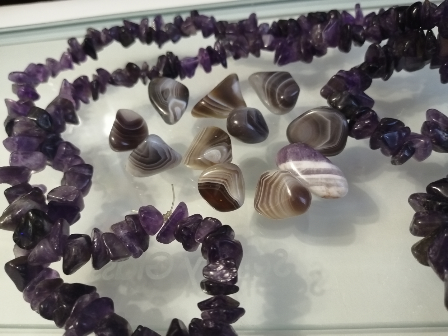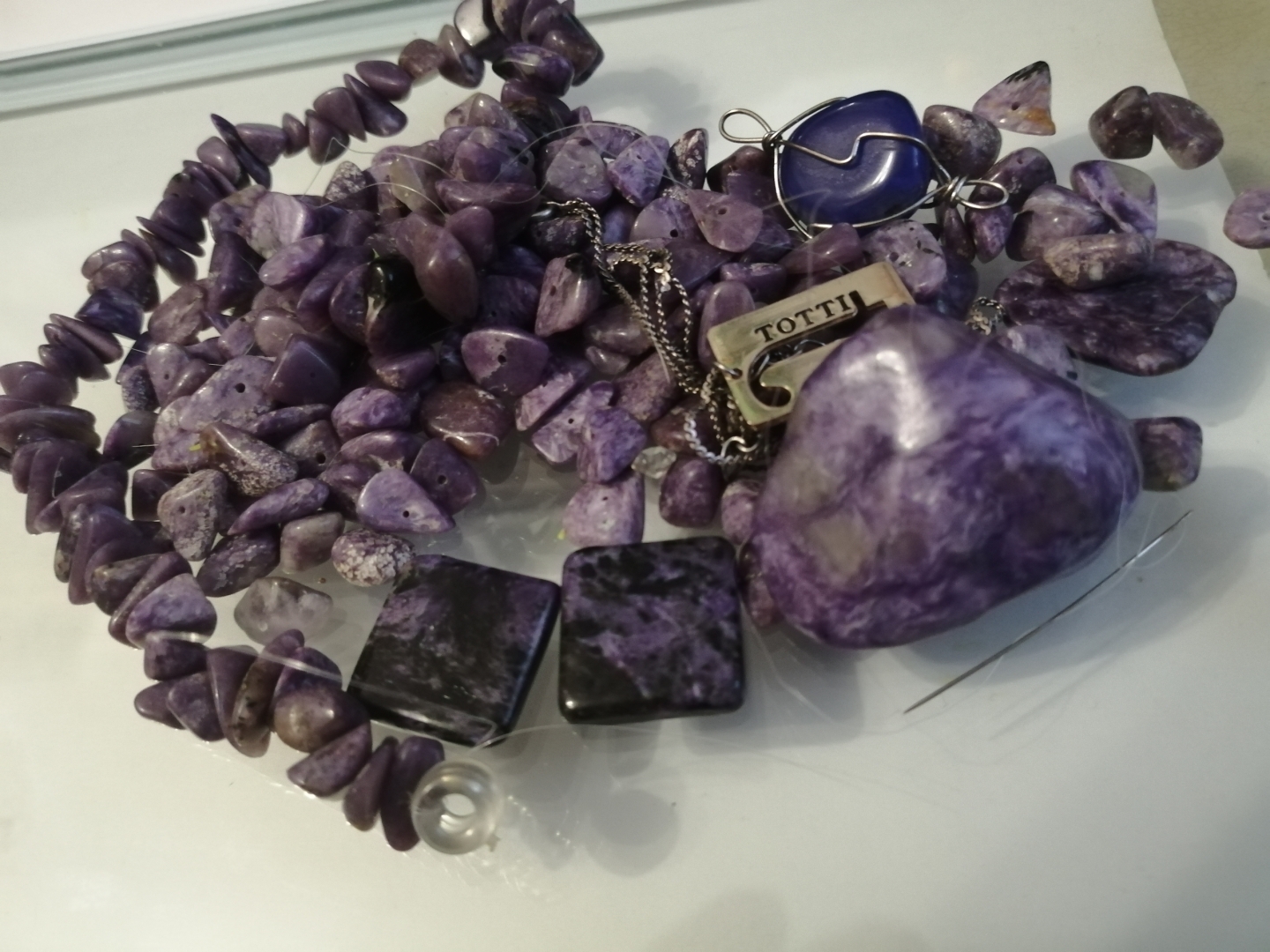 Невестке моей нравятся камни с включениями. А я обожаю сиреневые камни без ярких включений. Камни все разные у меня дома. Но было мало чароита, и совсем я незнакома с ГОЛУБЫМ КАЛЬЦИТОМ и АПАТИТОМ.