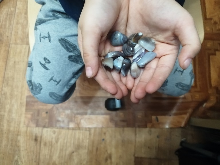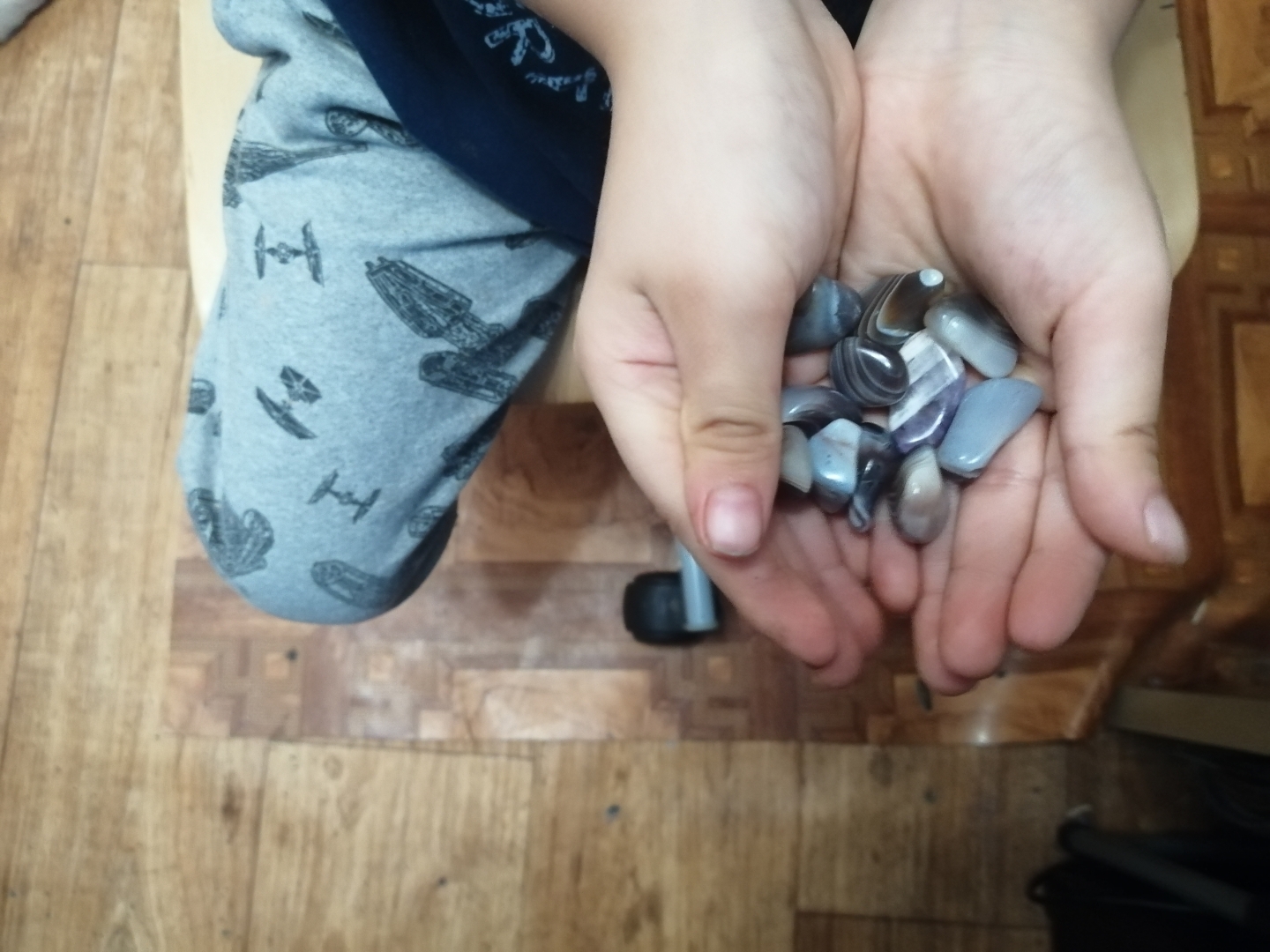 Тимоша уже понял, что бабан чокнутая на камнях. И принес мне в подарок камни, подобрав их у обочины дороги. Я приняла подарок. И просверлила дырку в камне. Теперь ношу камень на шнурке. Детей обижать нельзя. Тимоша так радовался, когда я сверлила камень...
