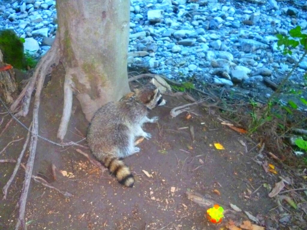 Там же мы увидели енота, прикованного цепью к дереву. И тоже рядом ни воды, ни еды.