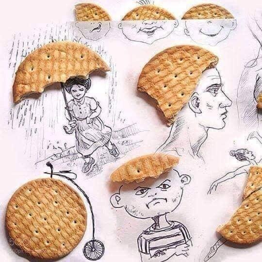 Из любого предмета, будь то авокадо, туалетная бумага, кухонный нож, макароны – он творит бесподобные картины. Заметьте, что иногда рисунок – это легкие наброски карандашом.