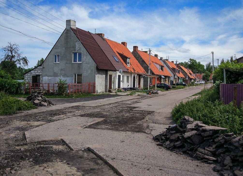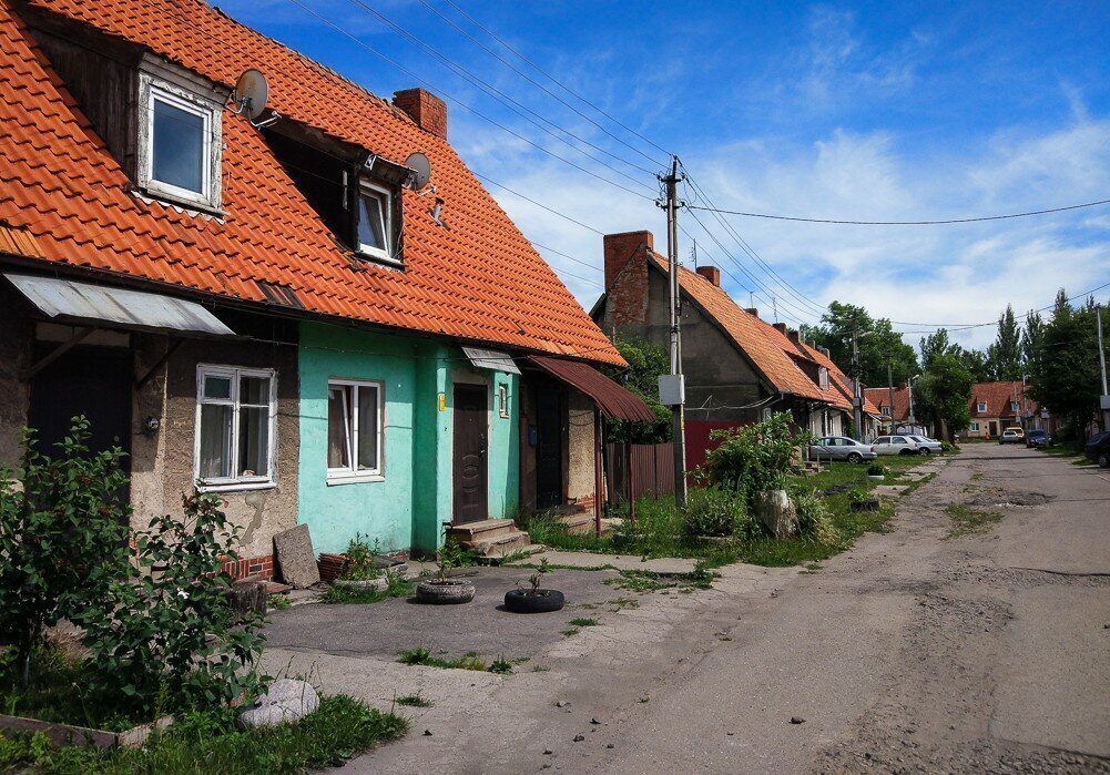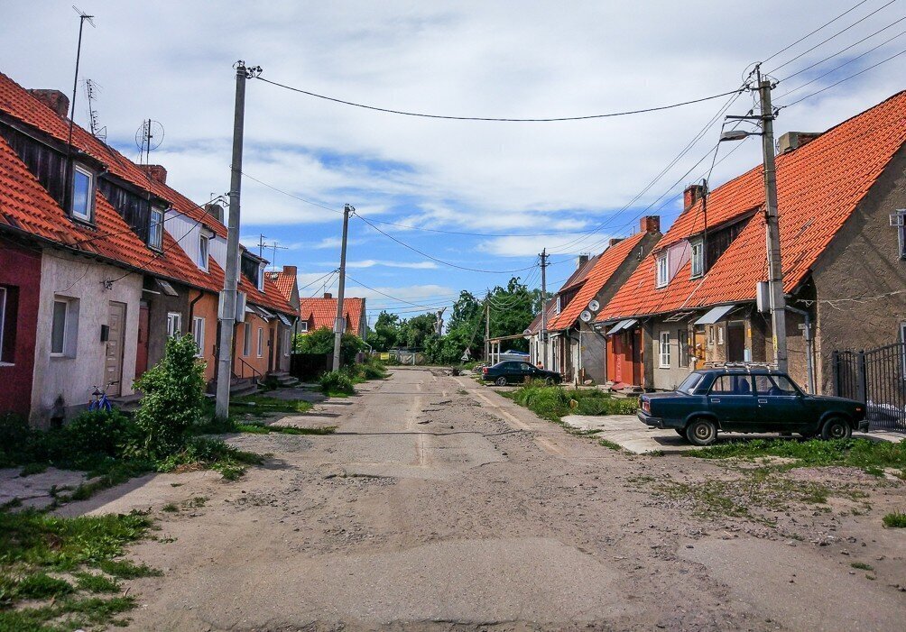 Окраина города Балтийска. Тут туристов не бывает. Машину оставили. Дорога вся убитая. Куски срезанного асфальта. Такое ощущение, что начали латать дыры, да так и бросили. Шли огородами. Вышли на очень старую улицу. Домики-то все немецкие! Столетние таунхаусы прямо! Подозрительная тишина, аж уши резануло. Ни одной живой души на улице. Шли и любовались немецкой черепицей, кое-где была уже наша, современная, но она восторг не вызывала.