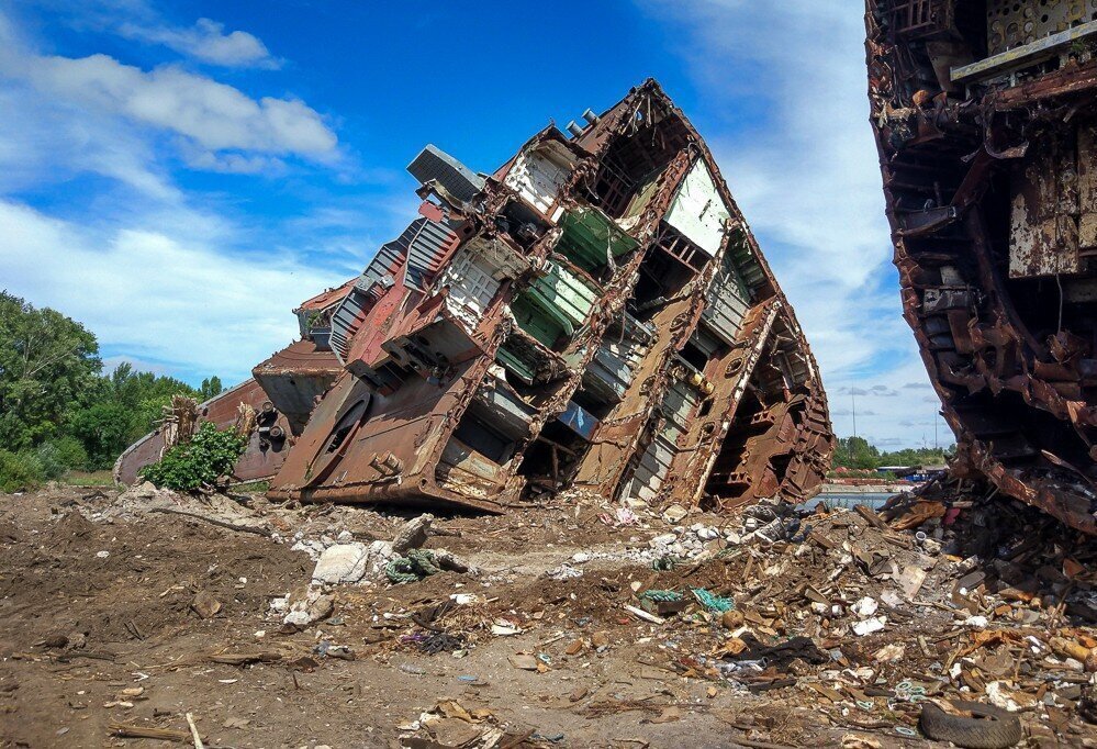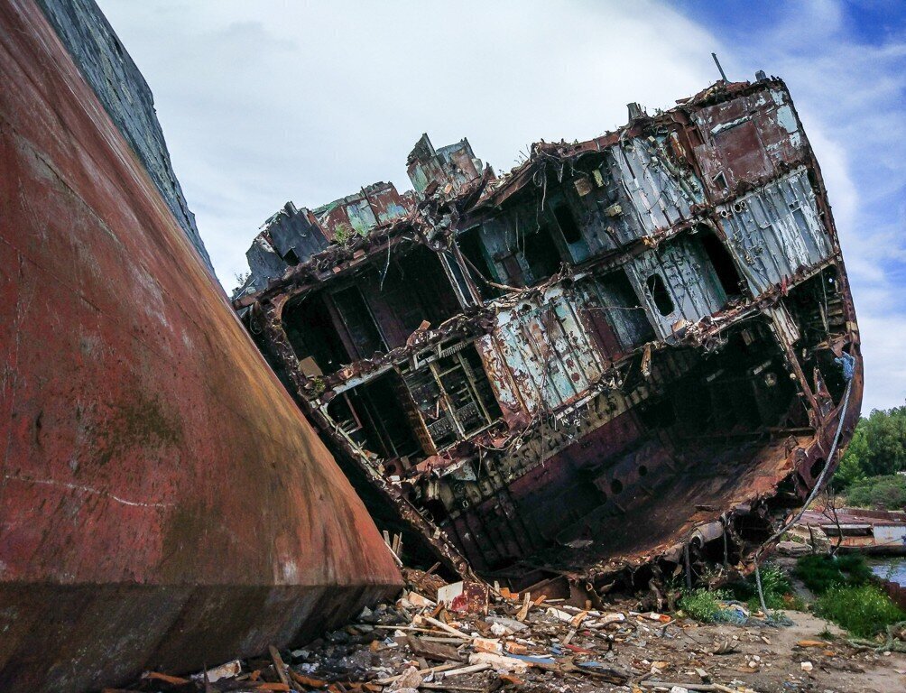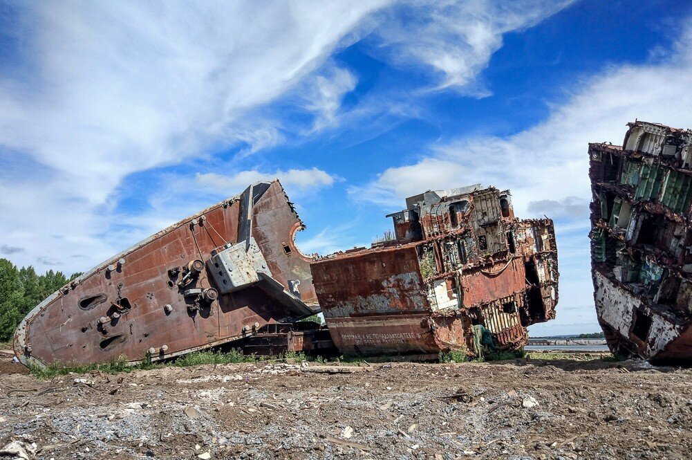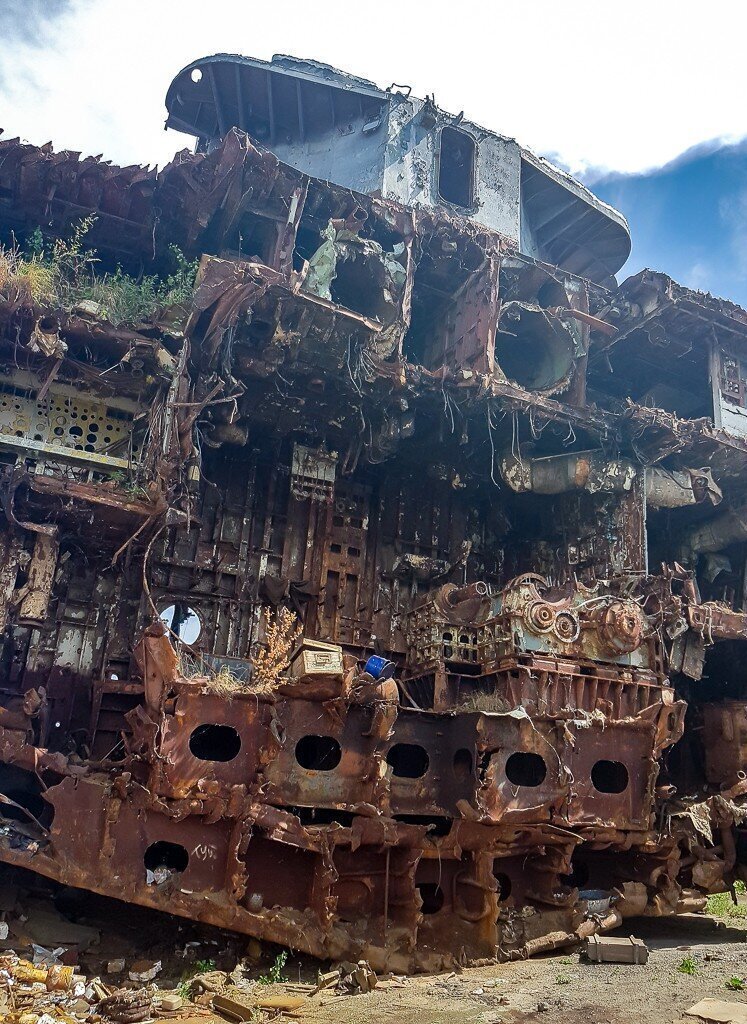 Это же кладбище кораблей! Ну конечно же! Я когда-то давно о нём читала, но не интересовалась локацией. А тут на тебе! Подарочек! Словно гигант распилил саблей огромного тунца! Всё порезано на ровные куски. Начала искать информацию в интернете. Оказалось, что это остатки фрегата "Неукротимый". Был выпущен на воду в 1976 году. Построен на нашем заводе "Янтарь", кстати, он по сей день строит корабли. У фрегата славная история, не стану всё перечислять, но побывал он во многих странах. "Погиб" "Неукротимый" в 2012 году. Там был и пожар, и пробоины. Спасти не смогли. Всему виной охотники за цветным металлом и коррозия.