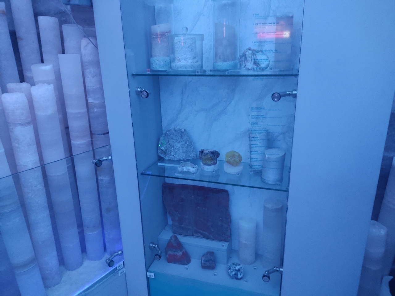 Стены и кристаллы - всё из соли. очень полезная процедура. Я бы ходила туда часто. Очищает энергетику, оздоравливает организм. Пока длится сеанс, показывают документальный фильм про образования и находку солевых залежей. Последний фильм про эволюцию динозавров.