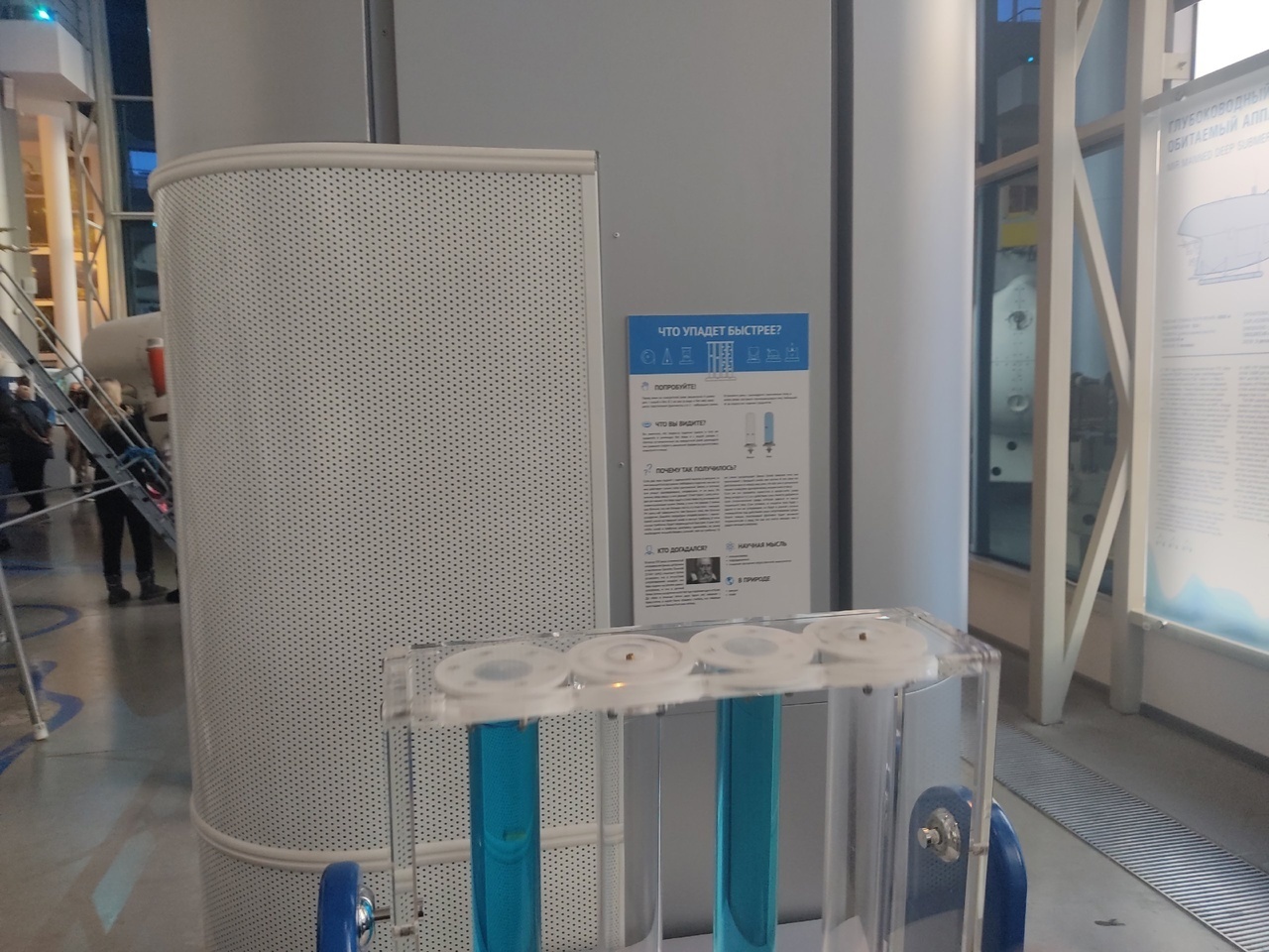 А это опыт, где быстрее упадёт шарик, в воде, воздухе или растворе. Тренажёр можно крутить.