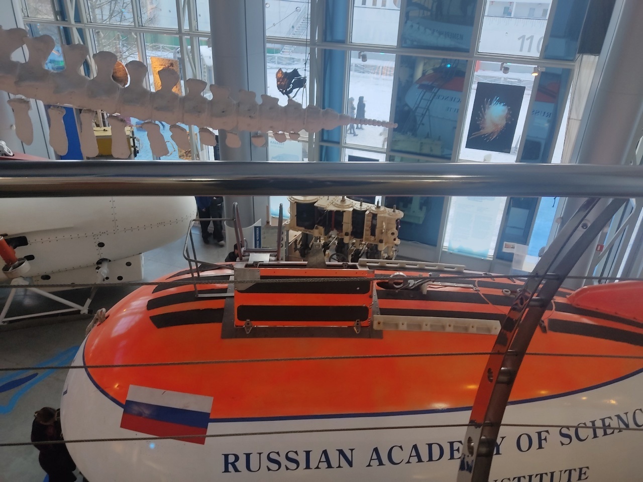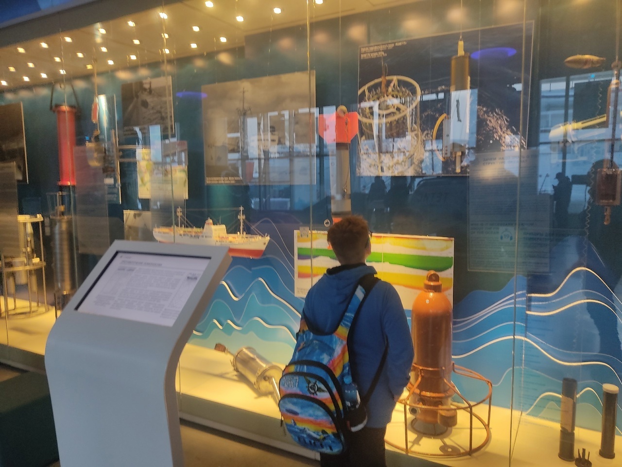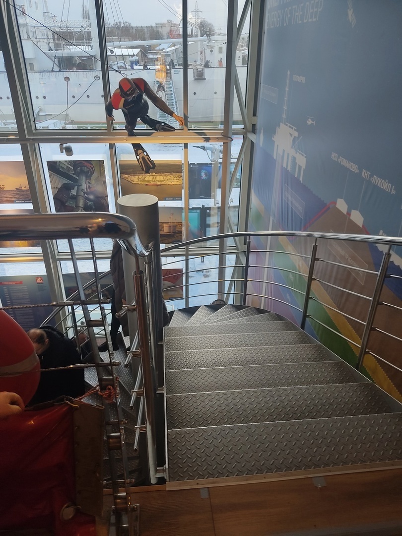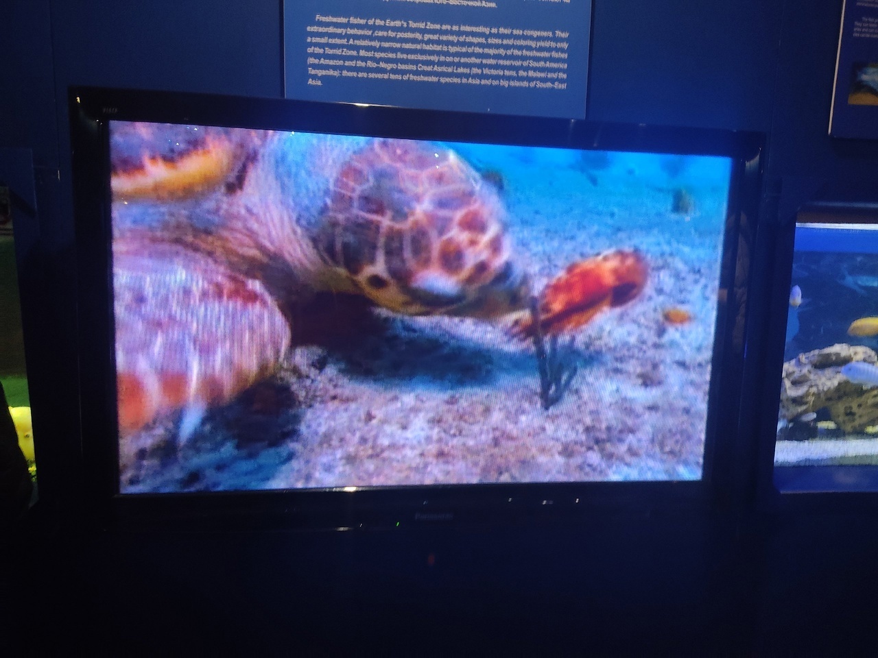 Оказывается, каждые 20 минут сеанс кино про морские глубины. Мы туда не попали из-за Батискафа. Потом время поджимало. Лишних 45 минут не было. Он находится в углу 1 этажа. Огораживают жаллюзями, чтобы не мешать посетителям исследовать экспонаты.