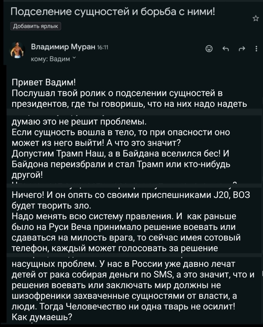 Послушал твой ролик о подселении сущностей в президентов, где ты говоришь, что на них надо надеть смертельную рубашку или ноги в тазик с цементом! Но я думаю это не решит проблемы.