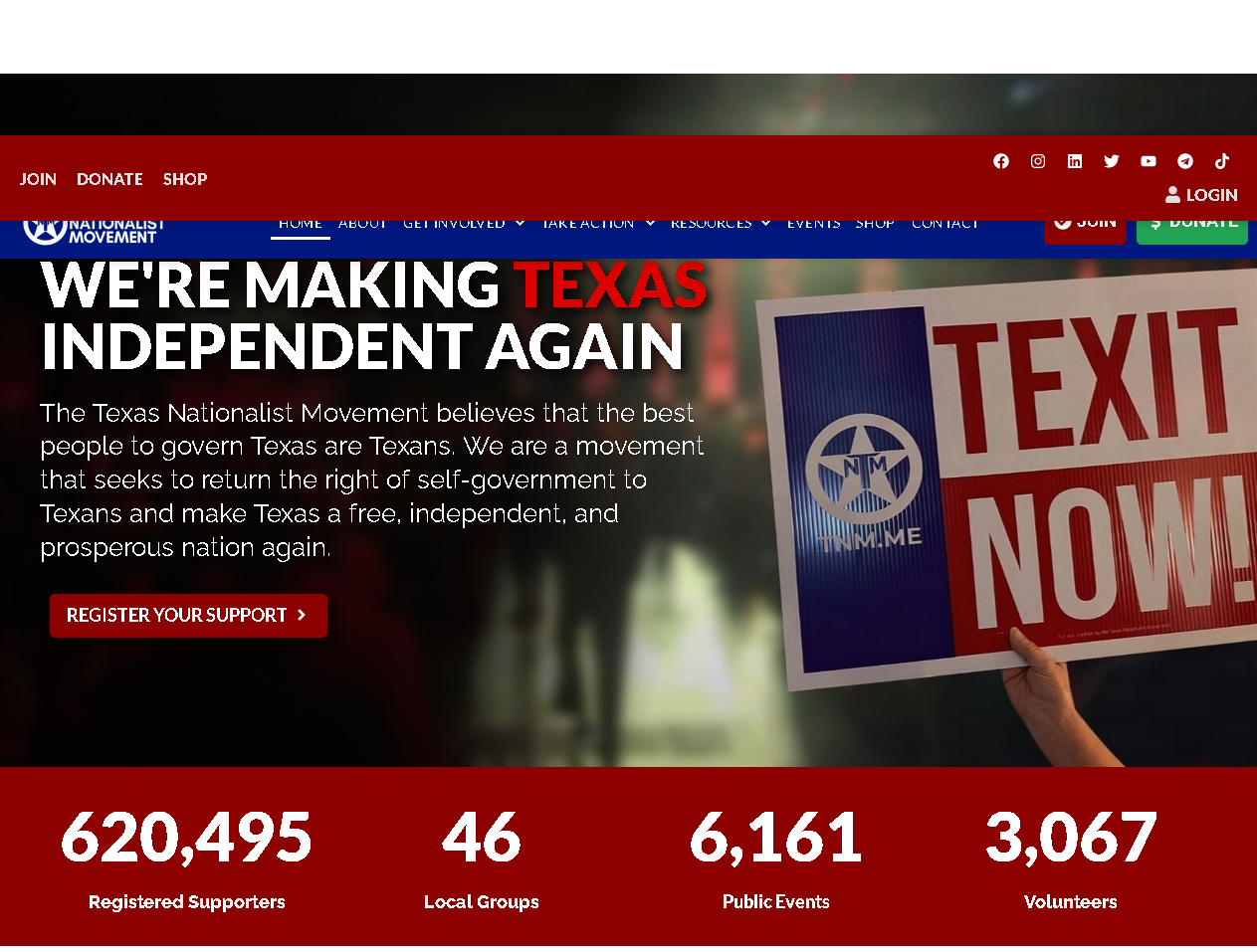 На сайте TNM написано: "Техасское националистическое движение считает, что лучшими людьми для управления Техасом являются техасцы. Мы стремимся вернуть техасцам право на самоуправление и снова "сделать Техас свободной, независимой и процветающей страной".