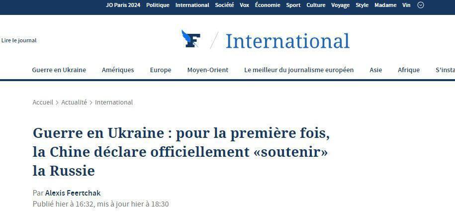 Le Figaro: Китай впервые публично поддержал Россию в спецоперации.