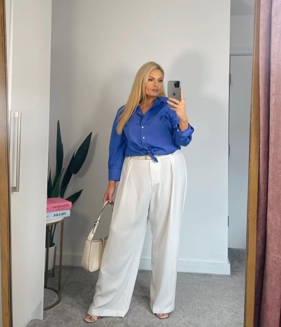 Прямые брюки идеальны для фигуры плюс сайз — скрывают все недостатки.А для того, чтобы сделать ноги еще стройнее, выбирайте модели со стрелками — это те самые вертикали, которые вытягивают силуэт.