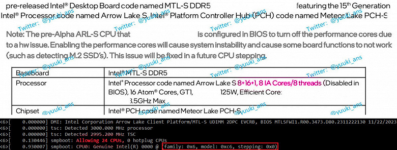 Вновь появились подробности о процессоре Intel Arrow Lake-S, который в скором времени появится в настольном сегменте. Хотя точное название модели остается тайной, известно, что процессор обладает 24 потоками, в то время как количество ядер остается неизвестным, учитывая ограничение малых ядер Intel без поддержки Hyper-Threading. Утечка также раскрывает базовую частоту в 3 ГГц. Процессор не поддерживает инструкции AVX-512.