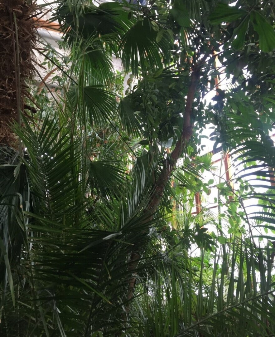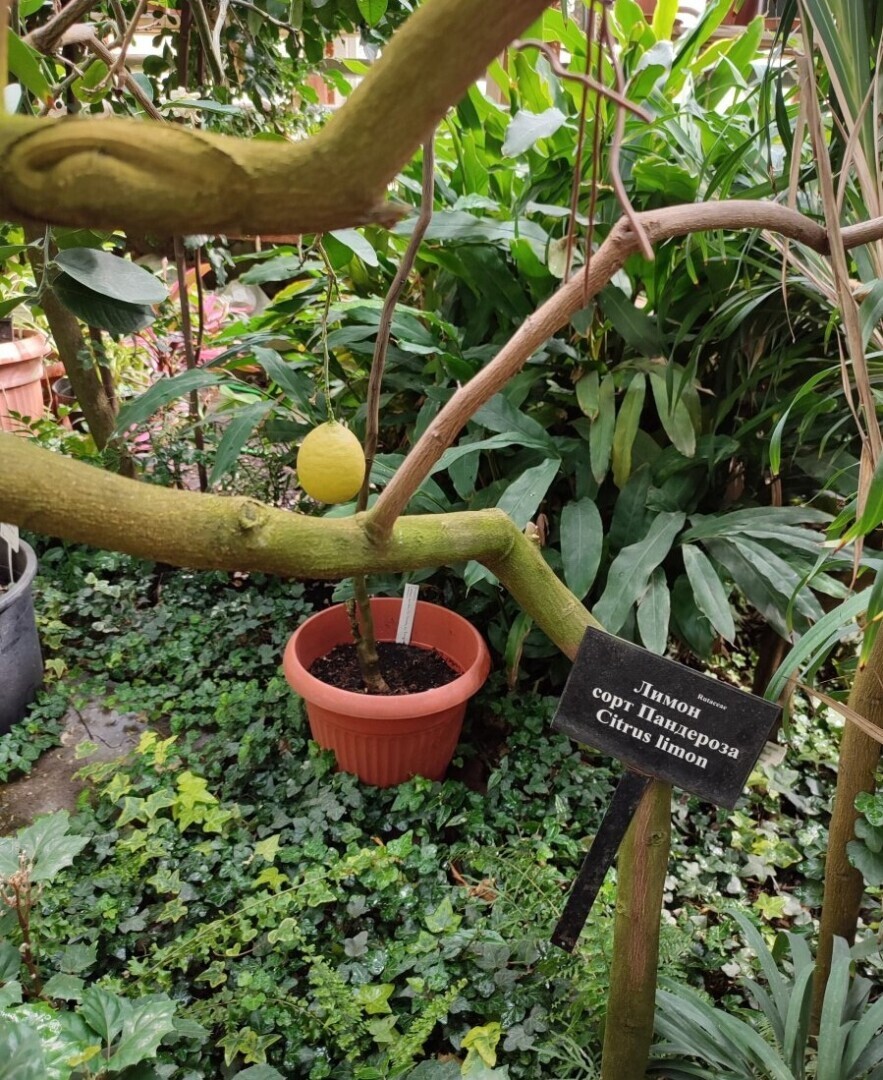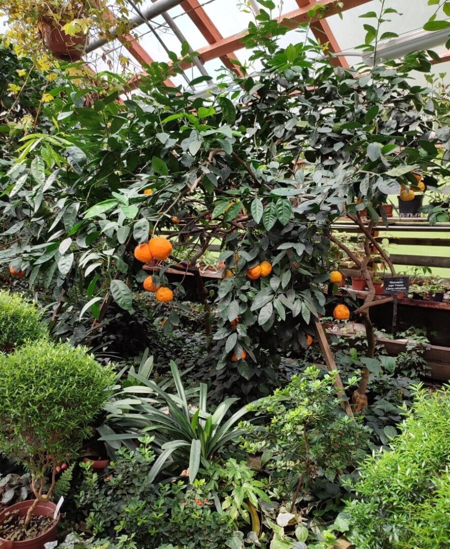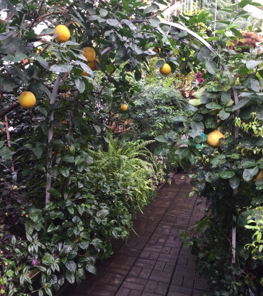 Много цитрусовых видов, апельсины и лимоны.Пальмы очень высокие, достают до верха теплиц.