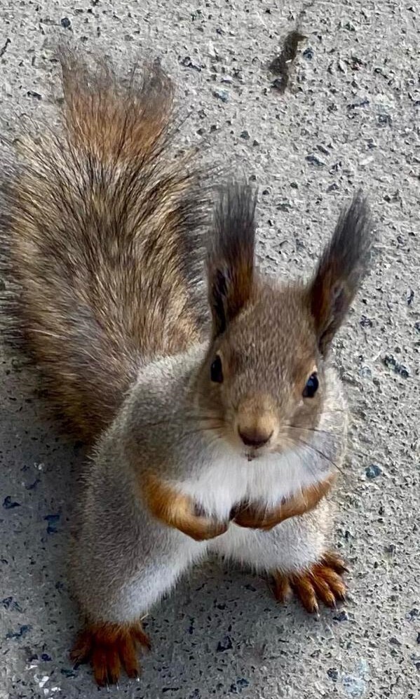 Тут много белок. Я их кормлю, но никогда не глажу, не трогаю, мало ли укусят. Белки привыкли к людям, не боятся.