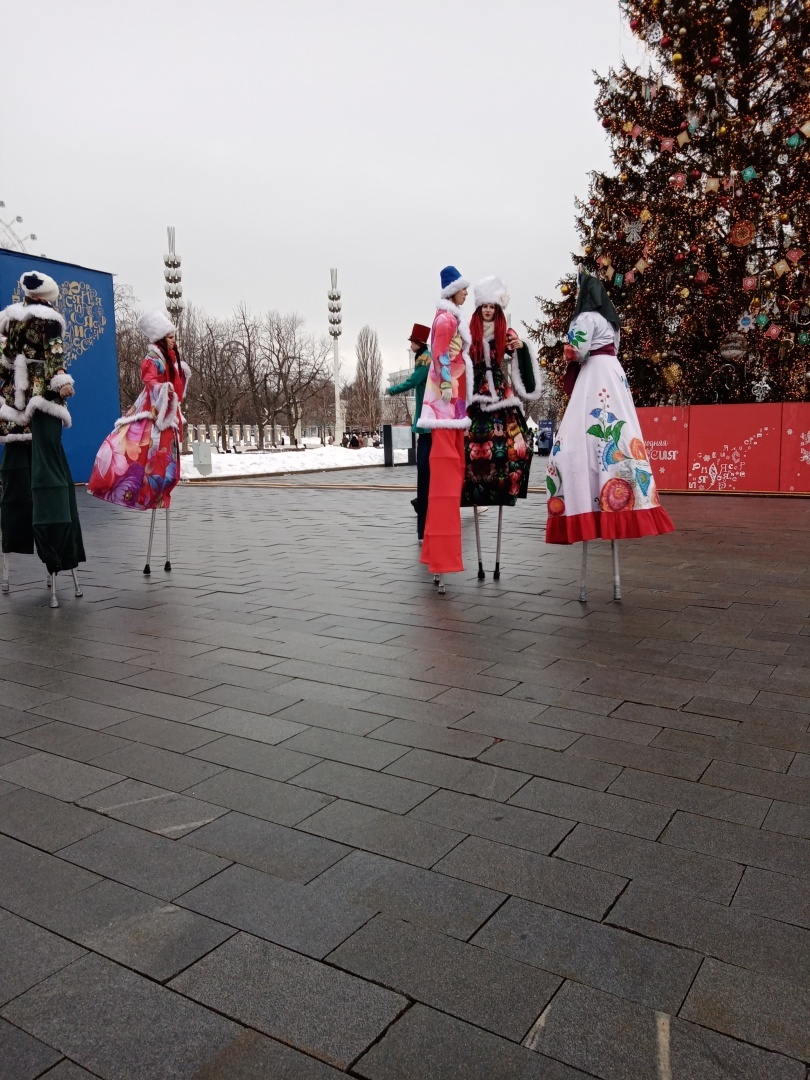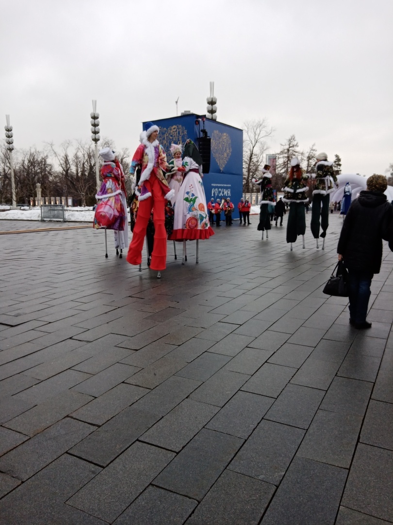 А вокруг музыка, танцы артистов на ходулях. Да душе просто праздник. А уж как артисты ходят на таких "палках", даже не представляю. Дети, гости выставки слушают оркестровую музыку, подплясывают под неё. Постоянно хочется улыбаться! Народ веселится!