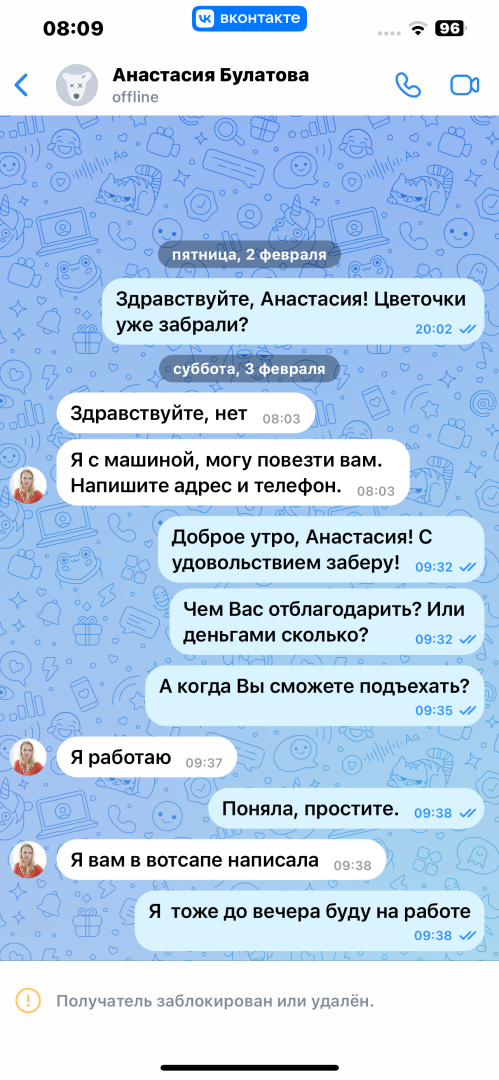 Обратите внимание на странное смс от Натальи Андрусенко, которая пишет, что договорится в личных сообщениях и заберет цветы. Ее профиль создан на один день.