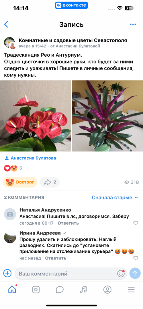 Ооо.. А я вот несколько лет назад деньги перевела две с чем-то тысячи рублей за фиалки узамбарские сортовые с доставкой почтой... Некоей Алле Цепруновой. Несколько месяцев ждала, потом столкнулась с другими потерпевшими, которые ждали ещё дольше и в итоге все потерпевшие оказались в блоке... У этой бизнес леди бизнес аккаунты в Одноклассниках и ВКонтакте - процветают. Сделать ничего невозможно. Обратилась в полицию, беда в том, что сумма ущерба немногим недотянула до 2500 руб. Либо надо было, чтобы потерпевшие массово сами также обратились в полицию, а это волокита. И эти дела бы объединили в одно и то возможны нюансы. Лично начальник угро мне всё разъяснил на пальцах. В общем как я поняла, к Алле Цепруновой полиция всё-таки нагрянула. Но она, как мне и было заранее объяснено, сослалась на очередной неурожай. Ну, вот уж неурожай этот длится несколько лет. Вот незадача. После Алла была так возмущена этим визитом полиции, что сделала в соцсети в личку массовую рассылку о том, что она таких как я обязательно через суд накажет за клевету. Ага... Мне же только удалось добиться того, чтобы её данные по представленным доказательствам удалили с одного из списков селекционеров редких сортов фиалок. А так человек продолжает спокойно себе зарабатывать на наивных цветонутых как я и ни денег ни фиалок. Хотя я просила ее, раз не урожай такой долгий, ну, деньги верните. Она вроде из Воронежской области. Если кому-то будет надо, архив подниму.
