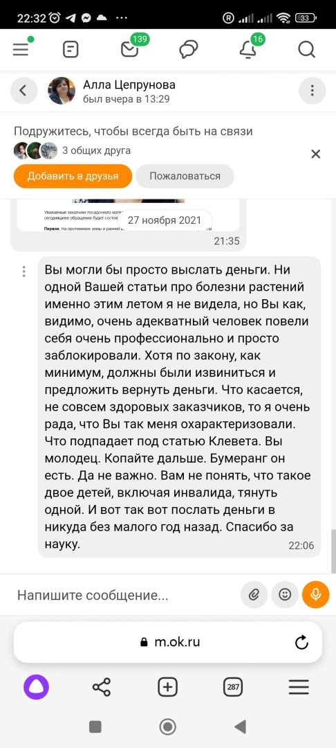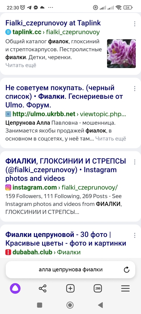 Ооо.. А я вот несколько лет назад деньги перевела две с чем-то тысячи рублей за фиалки узамбарские сортовые с доставкой почтой... Некоей Алле Цепруновой. Несколько месяцев ждала, потом столкнулась с другими потерпевшими, которые ждали ещё дольше и в итоге все потерпевшие оказались в блоке... У этой бизнес леди бизнес аккаунты в Одноклассниках и ВКонтакте - процветают. Сделать ничего невозможно. Обратилась в полицию, беда в том, что сумма ущерба немногим недотянула до 2500 руб. Либо надо было, чтобы потерпевшие массово сами также обратились в полицию, а это волокита. И эти дела бы объединили в одно и то возможны нюансы. Лично начальник угро мне всё разъяснил на пальцах. В общем как я поняла, к Алле Цепруновой полиция всё-таки нагрянула. Но она, как мне и было заранее объяснено, сослалась на очередной неурожай. Ну, вот уж неурожай этот длится несколько лет. Вот незадача. После Алла была так возмущена этим визитом полиции, что сделала в соцсети в личку массовую рассылку о том, что она таких как я обязательно через суд накажет за клевету. Ага... Мне же только удалось добиться того, чтобы её данные по представленным доказательствам удалили с одного из списков селекционеров редких сортов фиалок. А так человек продолжает спокойно себе зарабатывать на наивных цветонутых как я и ни денег ни фиалок. Хотя я просила ее, раз не урожай такой долгий, ну, деньги верните. Она вроде из Воронежской области. Если кому-то будет надо, архив подниму.
