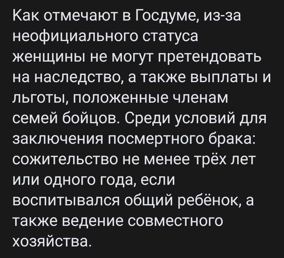 При принятии этого закона, женщина проживающая с мужчиной до отправки на СВО и их дети будут иметь равные права, как и замужняя!