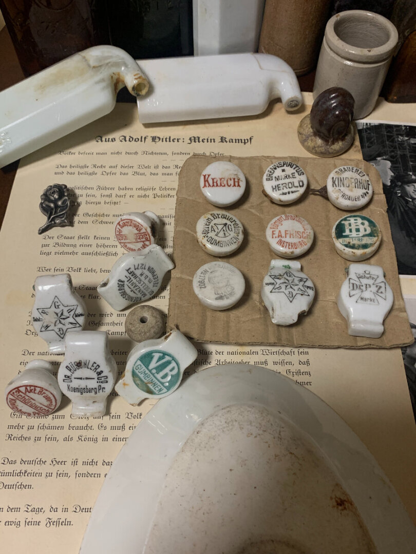 Помню в детстве, на огороде у бабушки, мы, внуки, откопали немецкий схрон с посудой. Но её было немного. Сейчас у мамы осталось одно блюдце. А вот пробок от пива было видимо невидимо. Даже копать не приходилось. Они лежали на поверхности. Чуть детской лопаткой копнешь, и на тебе! Пробка от Ганса! Этих "артефактов" также полно на рынке. Я даже знаю, где их берут чёрные копатели. Для коллекционеров, Бугельные пробки с различными названиями пива - просто идеальная находка! Раньше, в Кёнигсберге было несколько пивоварен, практически в каждом населённом пункте, и у каждой пивоварни был свой дизайн бутылок и пробок. Одинаковых не было. К примеру, пивная бутылка с надписью Инстербург или Кёнигсберг - прекрасный сувенир из Калининграда.