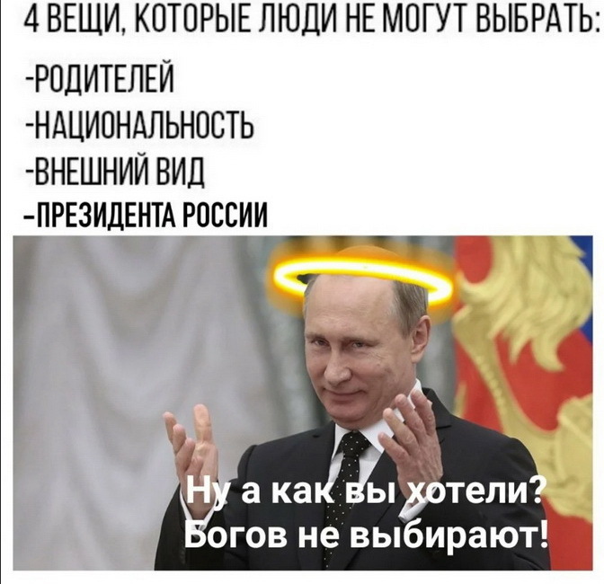 Рассмешила вторая картинка с надписью "Богов не выбирают!" А кто сказал, что Путин бог? Был бы он действительно Богом, простой народ жил бы припеваючи. А этот... думает только о себе и своих дружках. Прилип к креслу, не отодрать.