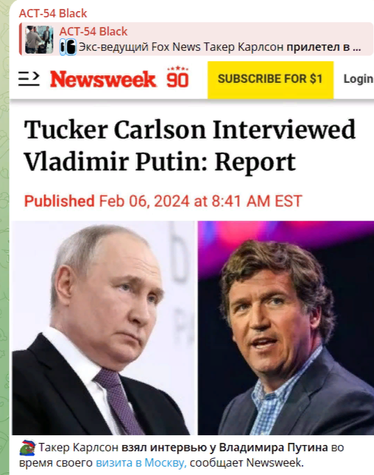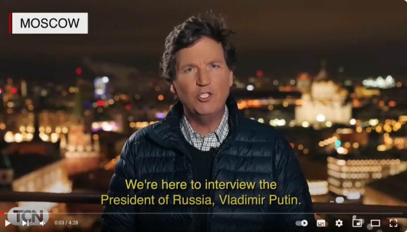 Обращение Такера Карлсона начинается с таких слов: "Мы в Москве, мы здесь, чтобы взять интервью у президента России Владимира Путина. Мы делаем это первыми, потому что это наша работа, которой мы занимаемся в журналистике, наш долг".